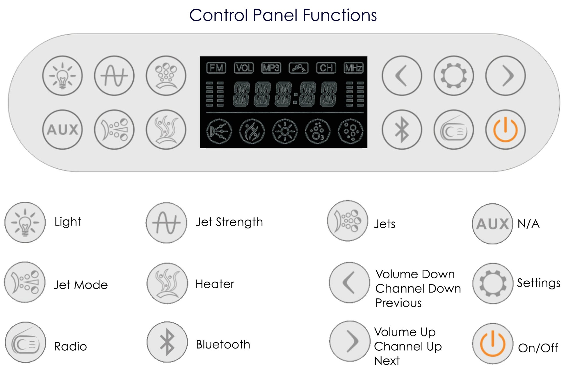 - Keypad Control Panel: Stylish control panel easily operates the bathtubs whirlpool jets, inline heater, digital sound system, and chromatherapy lighting.
