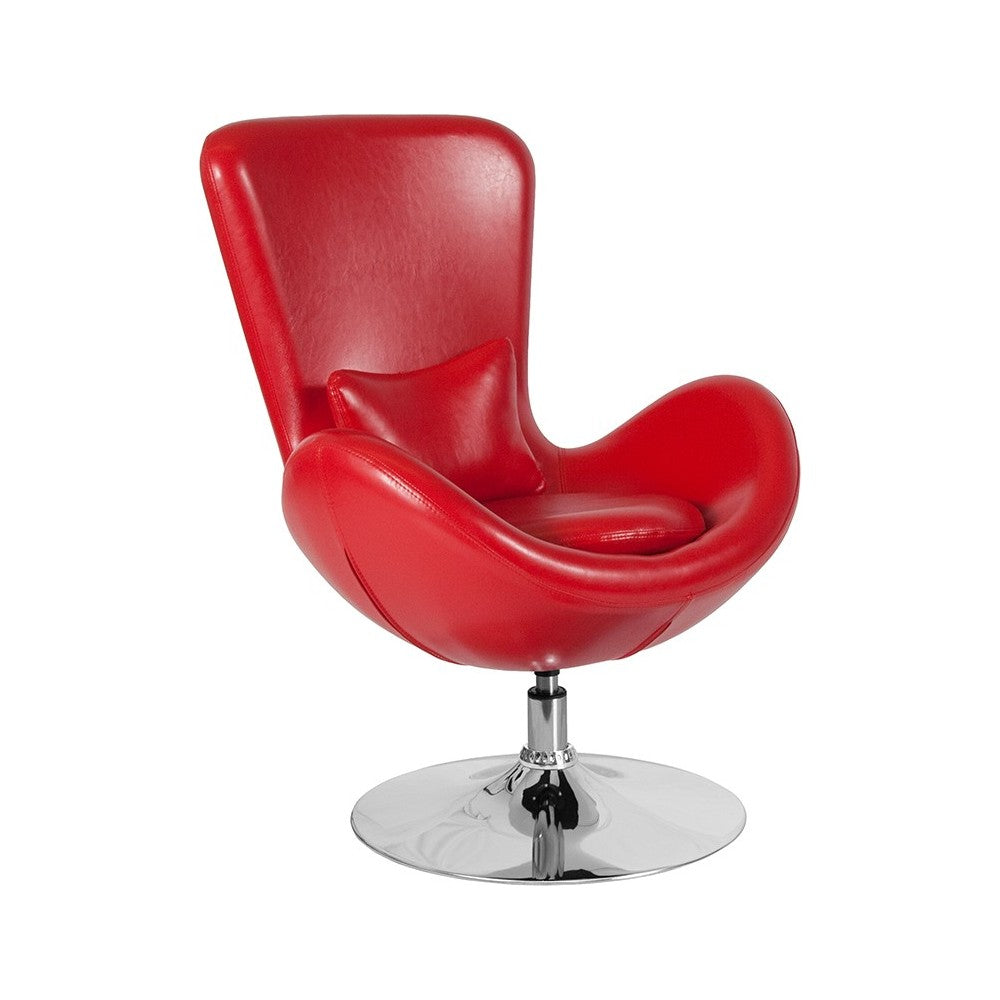 This high back upholstered reception chair will add an attractive detail to your lounge or office. This chair is highlighted with an outer lumbar pillow that provides lower back support and a swivel seat. Curved wing sides provide a stylish arm detail. The round chrome base features a plastic ring to protect flooring. Guests will be charmed at the contemporary seating with the added comfort. Please your guests with stylish seating that is made for comfort. [CH-162430-RED-LEA-GG]