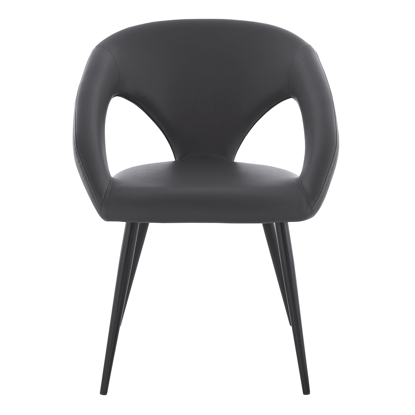 The Elin Gray Faux Leather and Black Metal Dining Room Chairs from Armen Living is the sophistication and refinement your dining room has been looking for. The seatback is curvy and clean - leaving you with a unique image of exuberance. The Elin features slotted sides that offer you an incredibly breathable seating experience. The metal frame is strong and stable and its accents are pleasing to the eye. The seat cushion is filled with foam padding - keeping you and your guests comfortable and relaxed while you visit with them. The Elin dining chairs come as a set of 2 and can support up to 250lbs per seat.