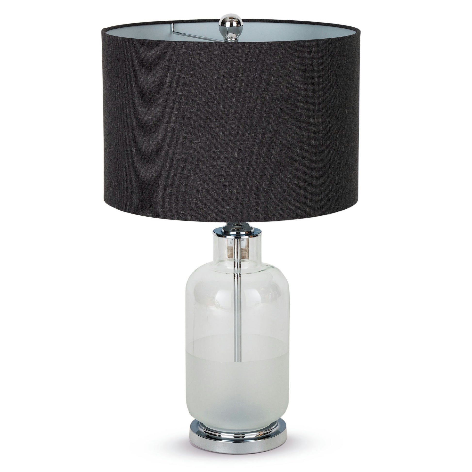 Illuminate your space with this stylish modern table lamp. The two tone glass base surrounds the interior metal rod, is topped with a dark gray shade for that clean, contemporary look