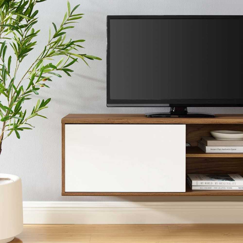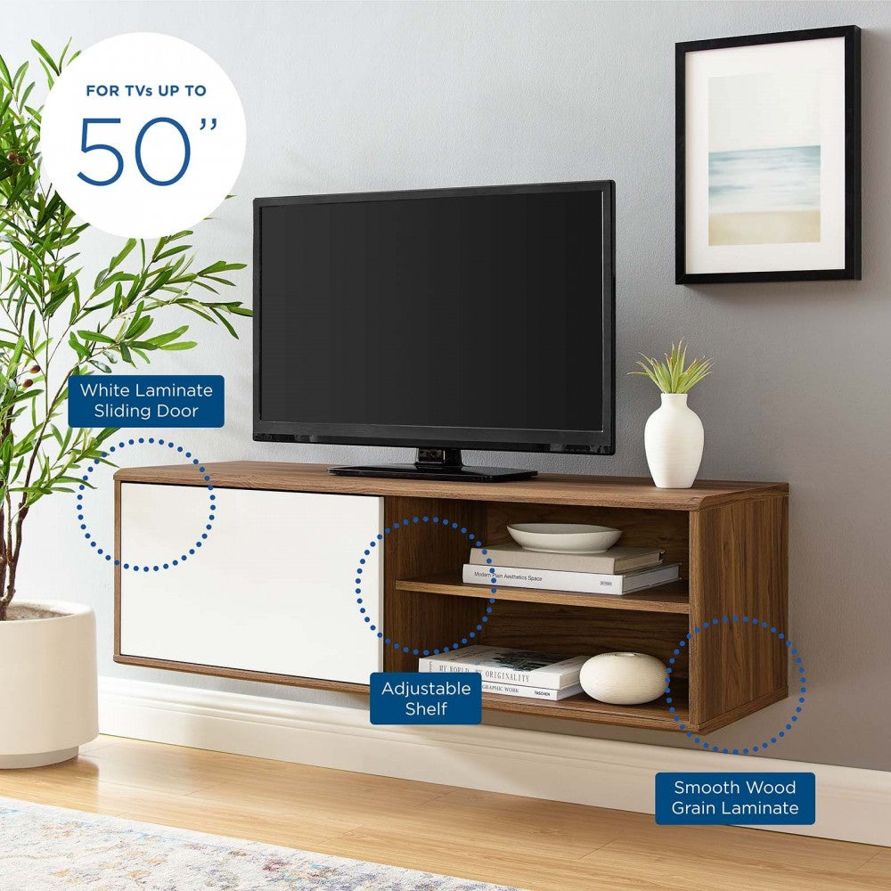 Elevate your entertainment decor with the Envision 46" Wall Mount TV Stand. Featuring an elegant linear silhouette, Envision comes designed with a sliding white door for concealed and open storage space, a height adjustable shelf for your game system, DVD or Blu-ray player, cable management holes, and walnut grain laminate over durable fiberboard for reliable support. Mounting directly to the wall, update your living room decor while keeping your visual space clean with this versatile TV stand. This wall mount media center accommodates flat screen TVs up to 50 inches.