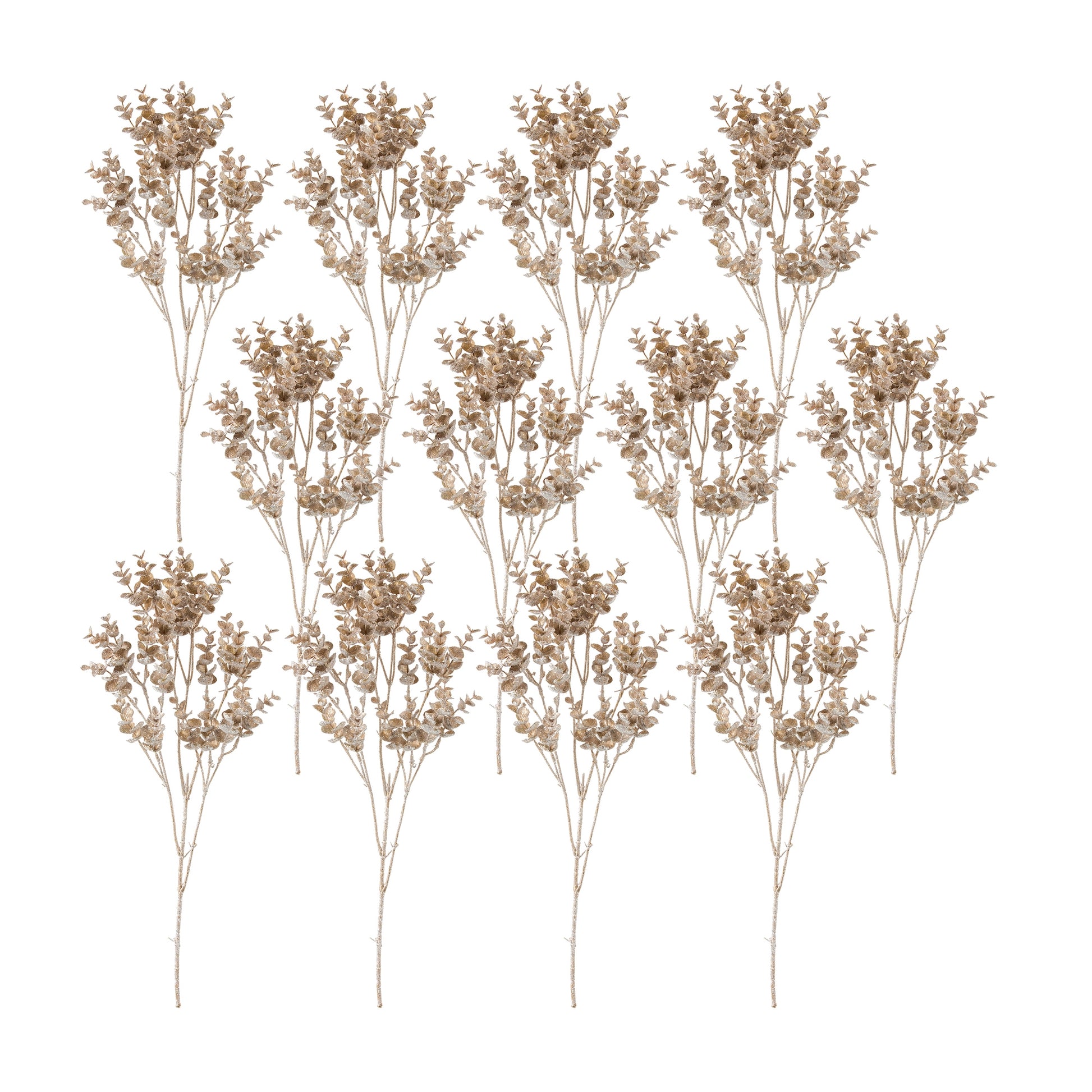 Add a touch of nature to your holiday decor with this beautiful set of Eucalyptus Sprays. Featuring twelve pieces, this set would make a great addition to your Christmas centerpiece or vase display. The realistic eucalyptus leaf design paired with the sparkley champagne finish is the perfect combination to create a stunning display. The quality plastic components are sure to last for seasons to come.