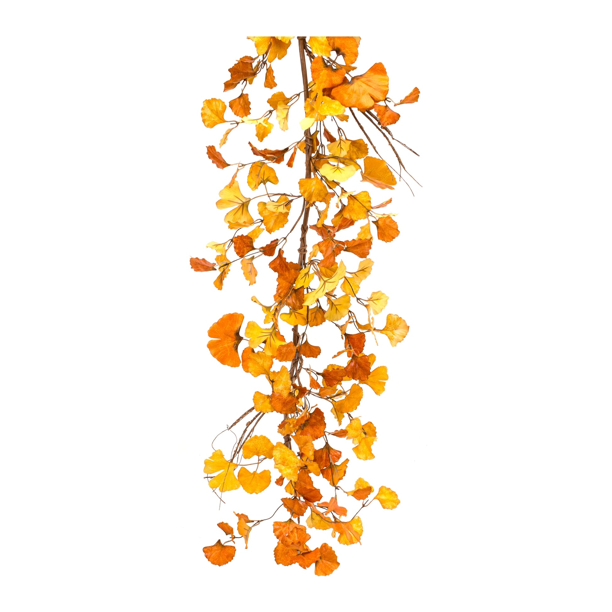 Get ready to host Thanksgiving Dinner with this beautiful set of Fall Gingko Leaf Garlands. Featuring two pieces, this set would make a great addition to your Thanksgiving centerpiece or mantle decor. The bright orange hues paired with the quality fabric foliage is the perfect combination to create a stunning fall display. Measuring 5ft in length each, thie piece is sure to make a statement in your home.