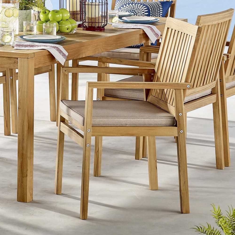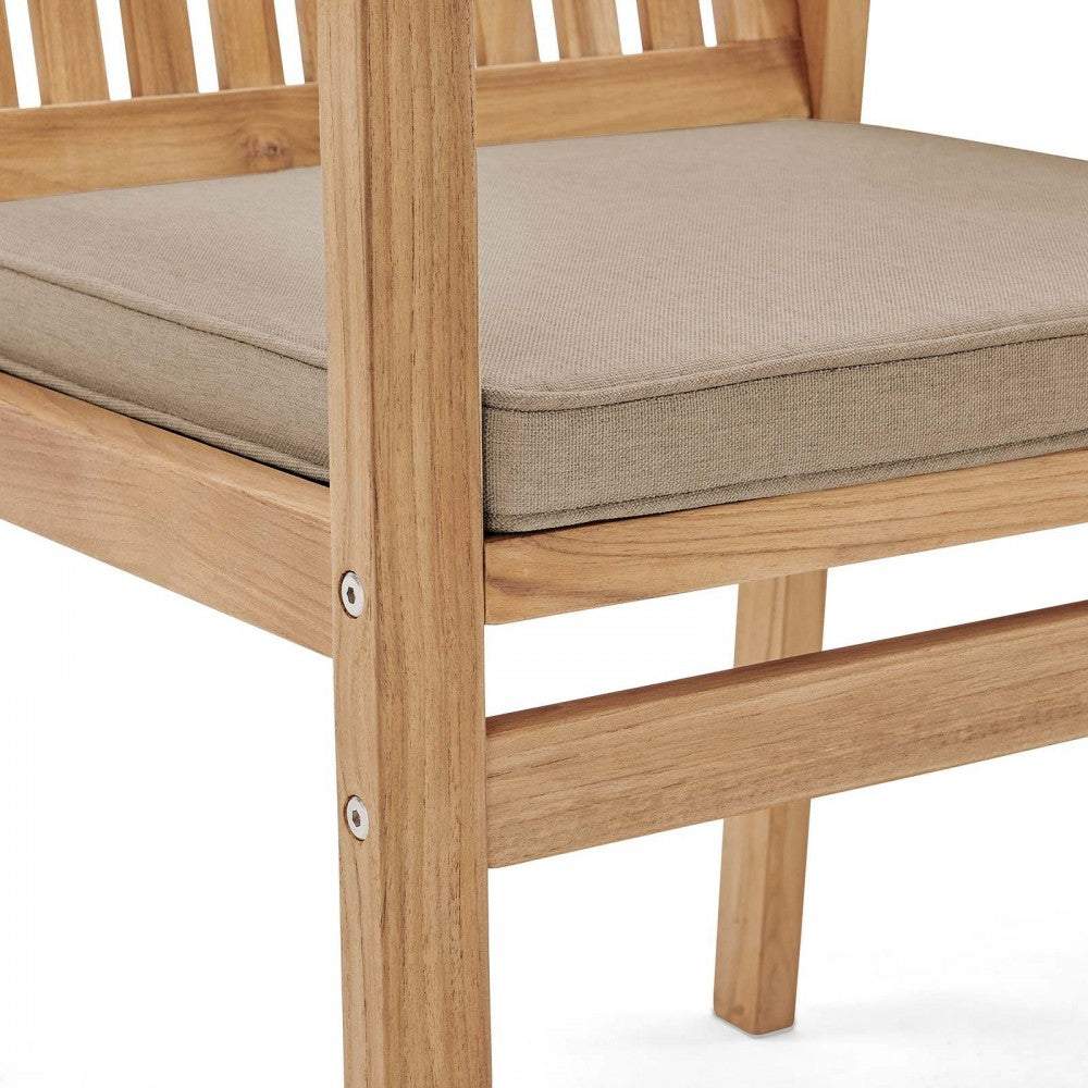 Update your outdoor decor with the Farmstay Outdoor Patio Wood Dining Armchair. Comprised of FSC certified solid teak wood, this outdoor chair is a refreshing addition to your patio dining furniture. Crisp lines form this smoothly designed patio chair with a slatted seat and back that creates a breathable airflow. The densely padded all-weather cushion comes with a durable machine washable cover. Complete with ribbons to secure the cushion onto the seat base, this outdoor teak dining armchair helps create a relaxing environment for your patio, deck, porch, or poolside. Chair Weight Capacity: 331 lbs.