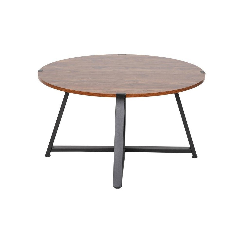 Step away from the ordinary and add a fresh new look to your home or business with this upgraded round coffee table. Round tables are extremely versatile and can be used in multiple areas to soften the straight lines of sofas and chairs and will tie the decor in your reception area together for a polished look. Circular tables can be used in large rooms as display tables and they give the illusion of space which is great for smaller living areas. Strength and durability are evident in the composition of this coffee table. Smoothly textured engineered wood in a smooth walnut finish sits atop a powder coated black steel tube X style frame. Metal screw reinforcements allow this table to accommodate up to 100 lbs.