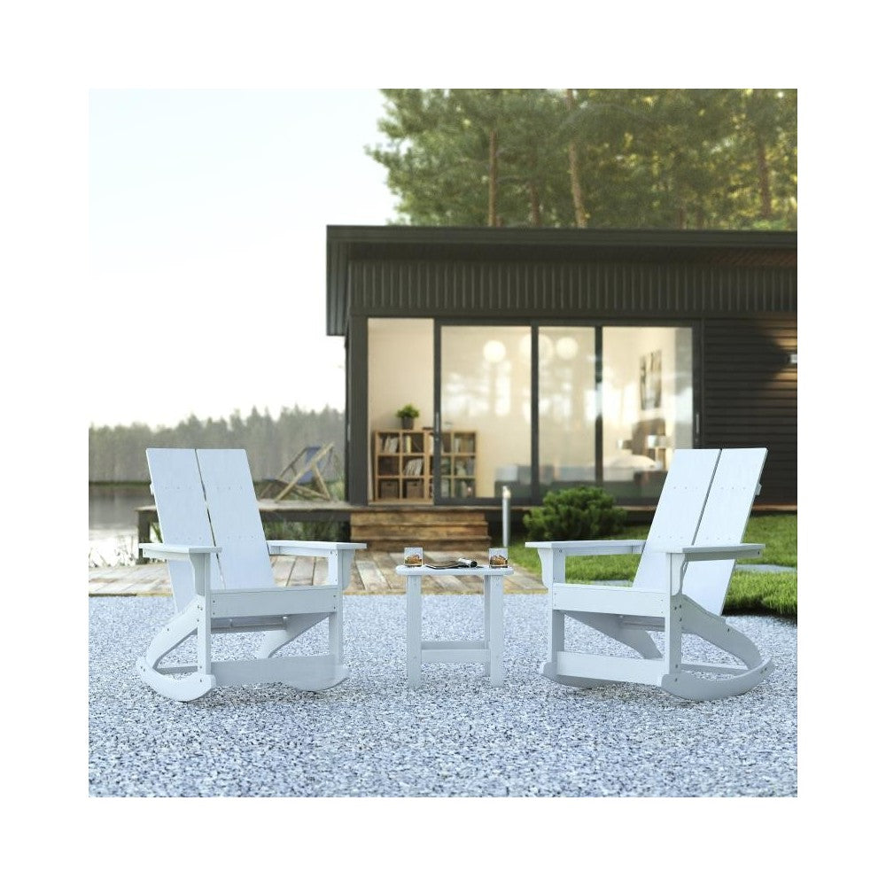 Take comfort anywhere you are with this set of 2 modern dual slat Adirondack rocking chairs with side table. This 3 piece seating set boasts an update on the classic Adirondack chair and is ideal on the front porch and in your sunroom. The smooth motion rockers allow you to rest and relax while the side table holds your belongings or decor. Designed to stand up to almost any environment, this indoor/outdoor seating set is long-lasting. Constructed from polystyrene, this table and 2 chair set is more durable than plastic and won't chip, splinter or peel but is lightweight and easily portable. Metal screws securely join all pieces allowing the chairs to hold up to 350 lbs.
