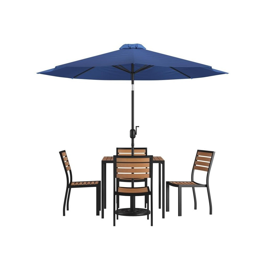 - All-Weather Faux Teak Patio Table & 4 Chair Set with Umbrella and Base