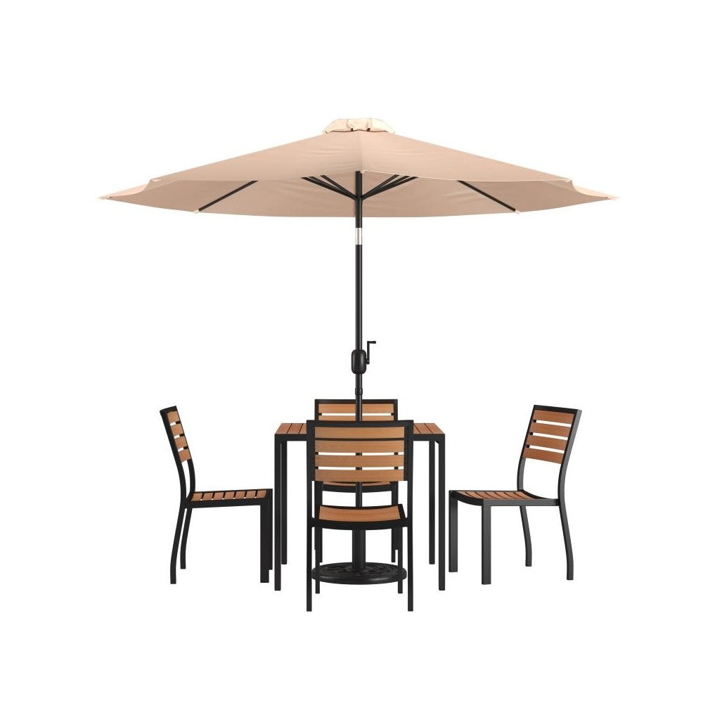 Setting up your outdoor space just got easier with this one stop 7 piece patio set bundle. Refresh the look of your existing entertaining space or add your personal touch to the new house you just moved into. Beautiful synthetic teak slats adorn the 35" square faux teak table and 4 chairs while the polyester tan umbrella, and weatherproof base keep you cool. The trending natural colored synthetic faux teak slats contrast beautifully with the black metal frames and look great in any space. The 18 gauge steel frame of the patio table and aluminum frame of the patio chairs hold up to 300 Lbs. static weight capacity. The 9ft market umbrella boasts push button tilt.