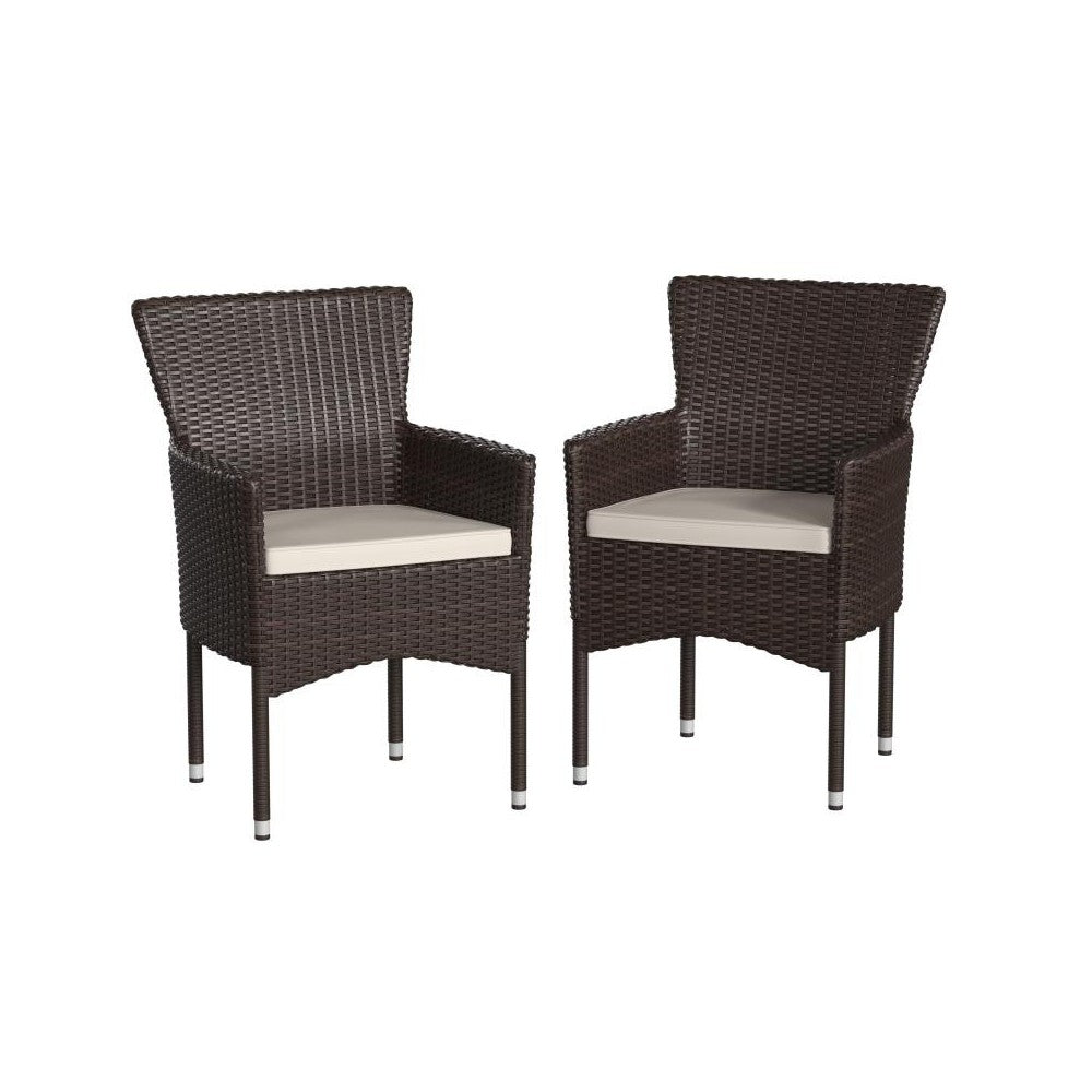 Relax in effortless comfort and style in this set of 2 wicker patio chairs with included plush high density foam cushions. A comfortably curved back gives extra support for lounging while the integrated armrests relieve tension from the neck and shoulders for truly restful seating. Featuring frames and cushions constructed from premium fade and weather-resistant materials, these backyard chairs are made to endure season after season and look just great whether they are used inside or outside. The powder coated steel frames are wrapped in polyethylene wicker, hold up to 350 lbs. static weight, and easily wipe clean with a damp cloth so you can spend more time sitting than cleaning.