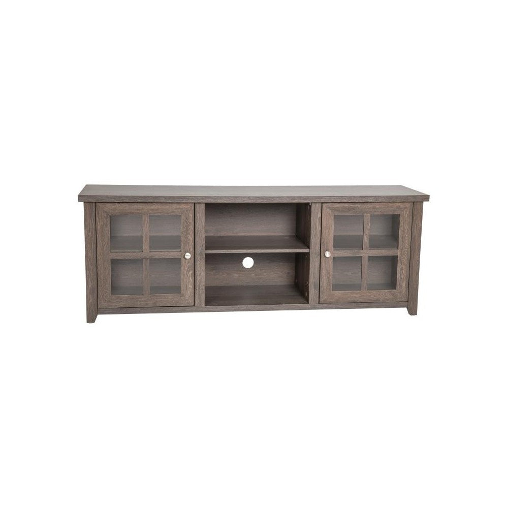 Set the stage for your big screen TV and create a focal point in your family room or living room with this classic style 4 pane TV stand. Whether you're moving and want new furnishings or just want to spruce up your existing space this traditional style media console has ample space to hold your TV and other electronics. From coastal to rustic, this versatile engineered wood 3 shelf TV stand holds up to an 80" TV and features a cord management port to keep your wires and cords tamed. Change up the look of your room and add more space for accessories and decor when you mount your television on the wall above this entertainment center. Your soundbar, gaming console and other electronics will tuck neatly away behind the glass doors.