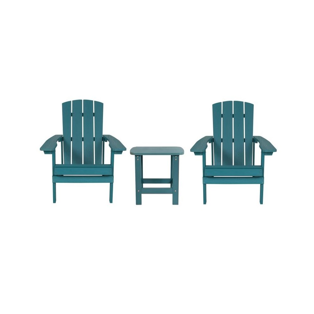 Everything you need to relax and unwind is right at your fingertips when you order this Adirondack style side table and 2 chair set. The classic design of this seating set has stood the test of time and will create a soothing atmosphere. A perfect addition to your patio, deck, or sunroom, this versatile indoor/outdoor conversation set invites you to settle in and stay awhile. Whether you're hanging out on the deck or around the firepit in the backyard comfort is essential. The Adirondack chairs have an extra wide back which allows space for decorative pillows or cushions and a slanted seat that encourages you to recline. The outdoor side table mimics the look of your chairs and holds your drinks, snacks, or your latest read.