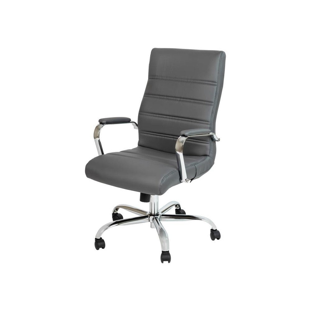 An elegant blend of comfort and style, this high-back LeatherSoft office chair is the perfect seating solution for your workspace. Crafted from gray LeatherSoft material with chrome arms and base, the ergonomic design brings a sleek look with ample durability and support for long-term use. Designed for exceptional comfort, this LeatherSoft office chair features a cushioned seat and back upholstered in gray LeatherSoft for softness and durability. Padding on the arms lends additional comfort, while horizontal stitching along the seat and back adds a touch of refinement. The high-back office chair features extended height to support your upper back and help relieve back tension.