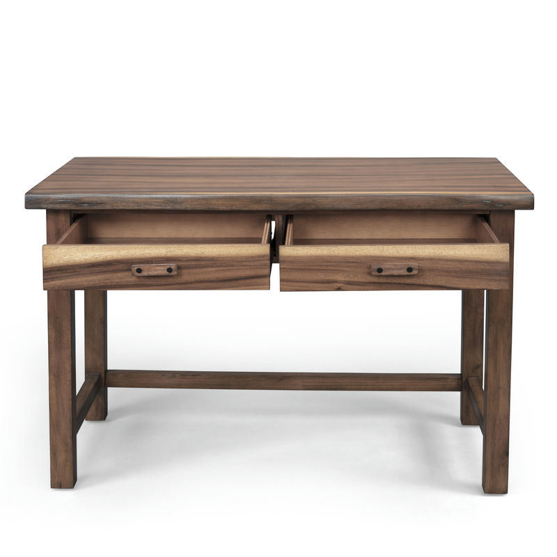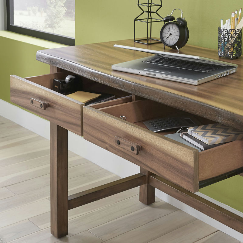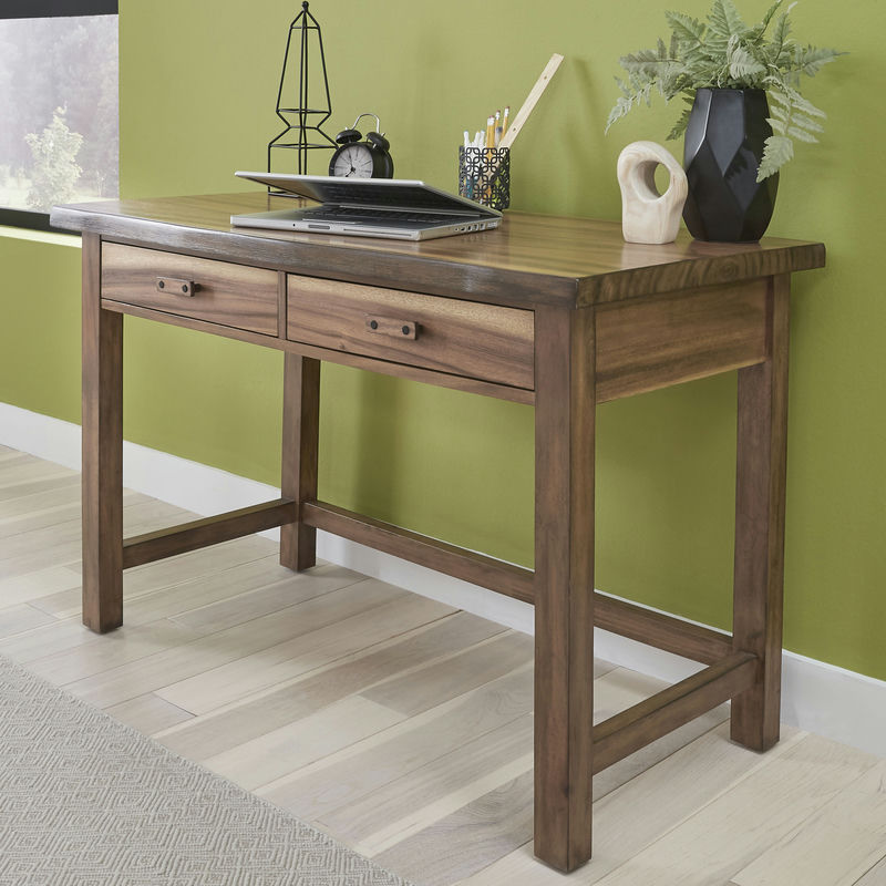 Inspired by the tropical rain forest, the Forest Retreat Desk captures the alluring look of a live edge design for a natural-looking rugged elegance. Crafted from tropical grained wood veneers over engineered woods, this desk is finished with a natural teak look that provides the dramatic light to dark grain pattern. Simple yet striking, the compact desk is ideal for small areas. Part of a whole home solution, the Forest Retreat Desk will transform your study or work space into an inviting haven.