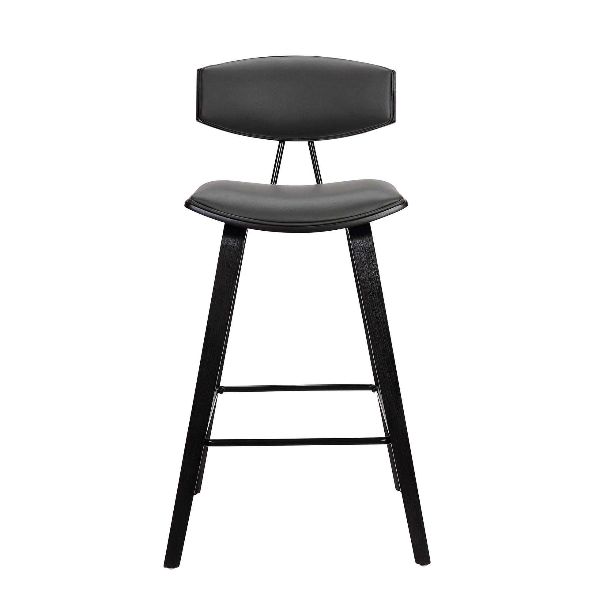 Whether drawn up to a sleek kitchen island for a breakfast nook or rounding out your home bar with a perfect perch, a bar stool like this is a versatile seating solution with sleek modern style. The Armen Living Fox 25.5" Counter Height Grey Faux Leather and Black Wood Mid-Century Modern Bar Stool is a sophisticated and functional modern piece certain to enhance the aesthetic of any style home or apartment. The high-density foam cushioned back, and seat will allow endless hours of entertaining or lounging. The curved wood medium high back with padded support is ideal for posture alignment and an unmatched support for days on end. The foundation of the product is supported by wood and steel footrest for a chic and stylish aesthetic without comprising practicality and functionality of this item. The Mid-Century Modern style silhouette gives you a timeless look with the durability to last for many years to come. Available in your choice of a 25.5” or 28.5” seat height, you can easily incorporate this stool into your kitchen, dining room, home bar, or office! The Fox Faux Leather and Wood Bar Stool is available in your choice of a black wood finish with black or grey faux leather upholstery or a walnut wood finish with cream, brown, or grey faux leather upholstery.