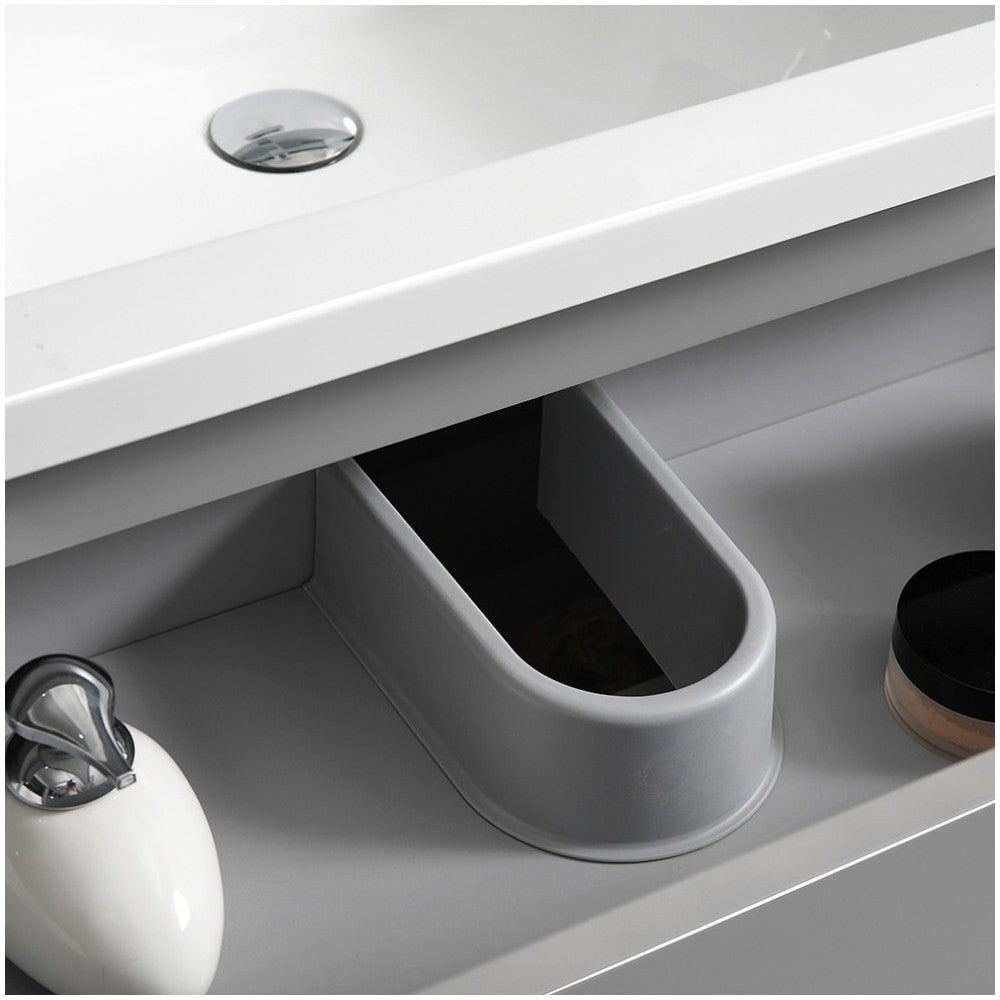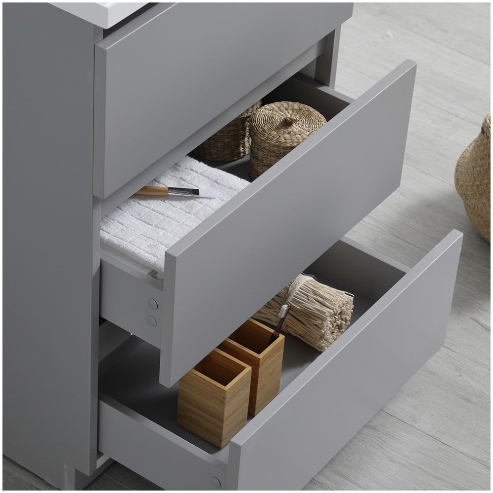 With its chic Gray finish, the Fresca Lazzaro Freestanding Modern Bathroom Vanity is the ideal combination of style and function. The cabinet offers great storage with soft-closing drawers, just perfect for organizing all of your daily essentials. The drawers feature push-release hardware, offering a streamlined front that beautifully complements the minimalist design. To make installation a breeze, the cabinet comes fully assembled and includes installation hardware. Gracing the top of the cabinet is an eye-catching white acrylic-resin countertop/sink with smooth edges and integrated overflow. The sink is designed for durability and style and has been pre-drilled to accommodate a single hole faucet (included). This vanity also comes with a fully mirrored medicine cabinet with two adjustable glass shelves, to complete the look. This modern vanity is available in multiple colors and makes a stylish statement in any home
