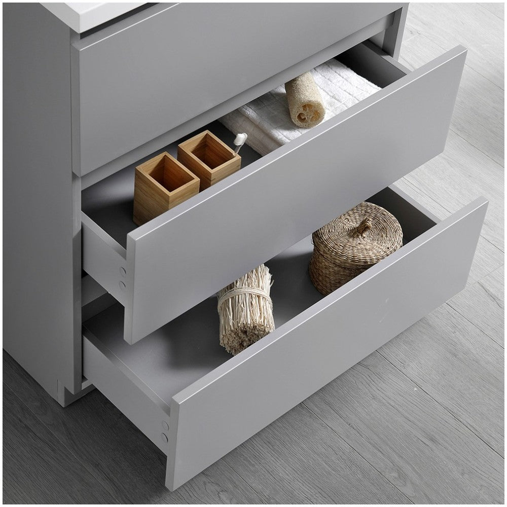 With its chic Gray finish, the Fresca Lazzaro Freestanding Modern Bathroom Vanity is the ideal combination of style and function. The cabinet offers great storage with soft-closing drawers, just perfect for organizing all of your daily essentials. The drawers feature push-release hardware, offering a streamlined front that beautifully complements the minimalist design. To make installation a breeze, the cabinet comes fully assembled and includes installation hardware. Gracing the top of the cabinet is an eye-catching white acrylic-resin countertop/sink with smooth edges and integrated overflow. The sink is designed for durability and style and has been pre-drilled to accommodate a single hole faucet (included). This vanity also comes with a fully mirrored medicine cabinet with two adjustable glass shelves, to complete the look. This modern vanity is available in multiple colors and makes a stylish statement in any home