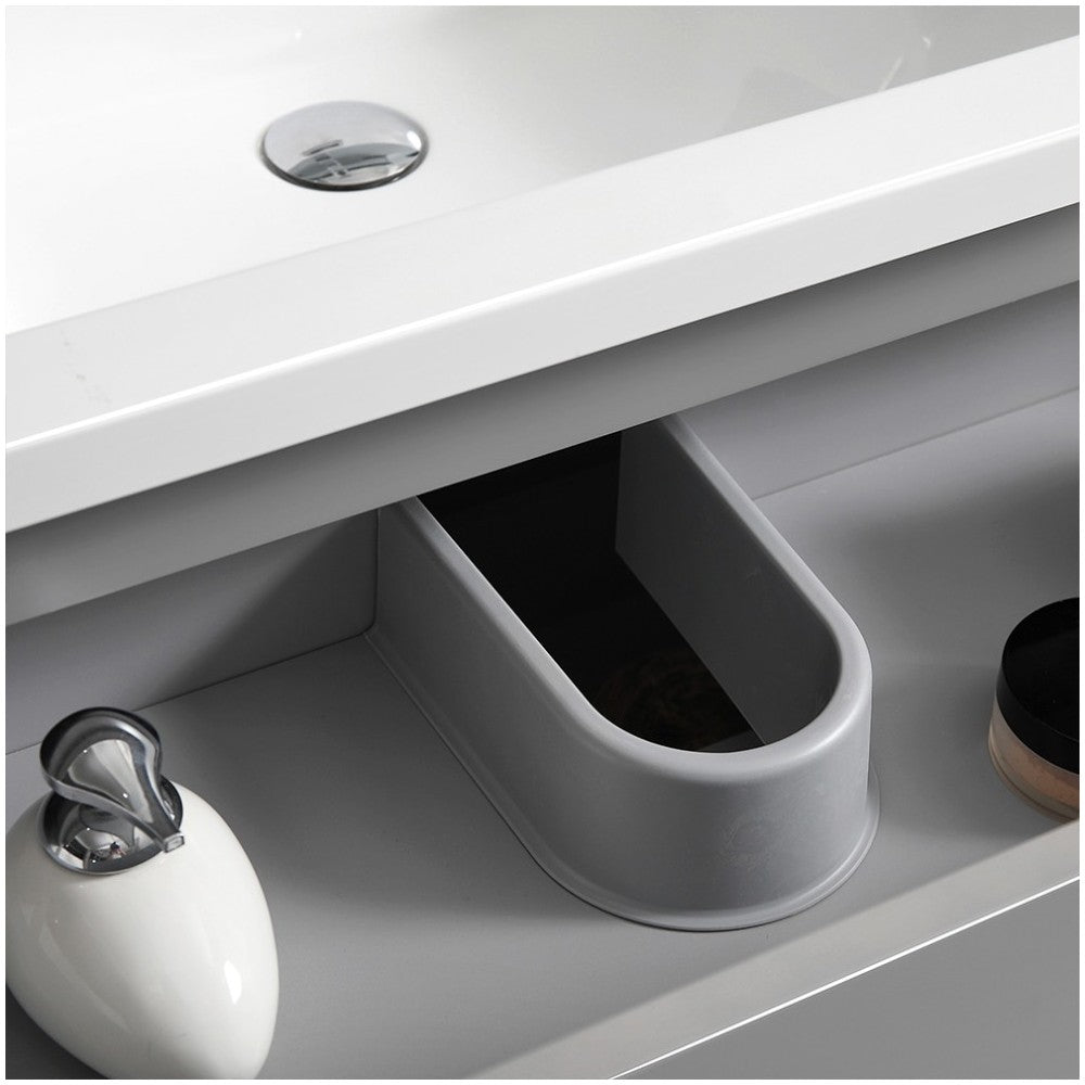 With its chic Gray finish, the Fresca Lazzaro Freestanding Modern Bathroom Cabinet with Integrated Sink is the ideal combination of style and function. The cabinet offers great storage with soft-closing drawers, just perfect for organizing all of your daily essentials. The drawers feature push-release hardware, offering a streamlined front that beautifully complements the minimalist design. Gracing the top of the cabinet is an eye-catching white acrylic-resin countertop/sink with smooth edges and integrated overflow. The sink has been pre-drilled to accommodate a single hole faucet (sold separately). This modern cabinet with integrated sink will enhance any decor and is available in multiple sizes and finishes. It includes installation hardware