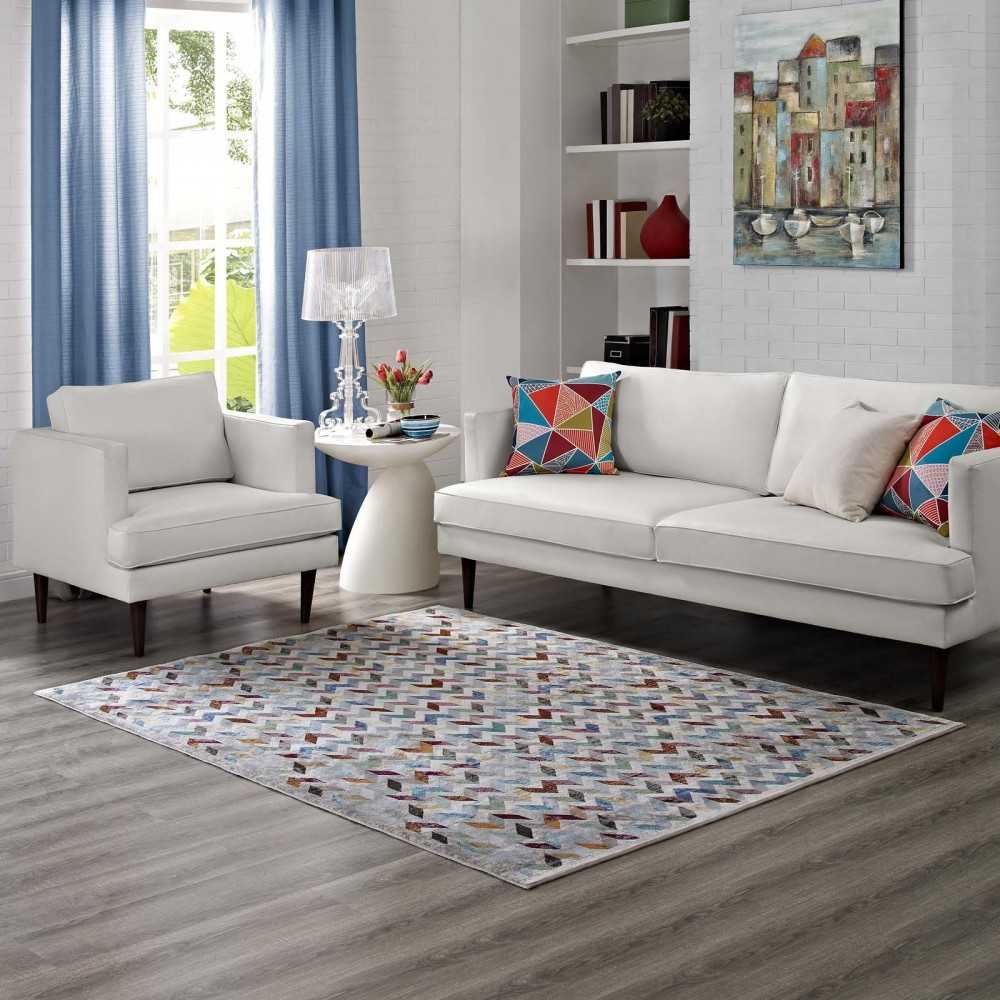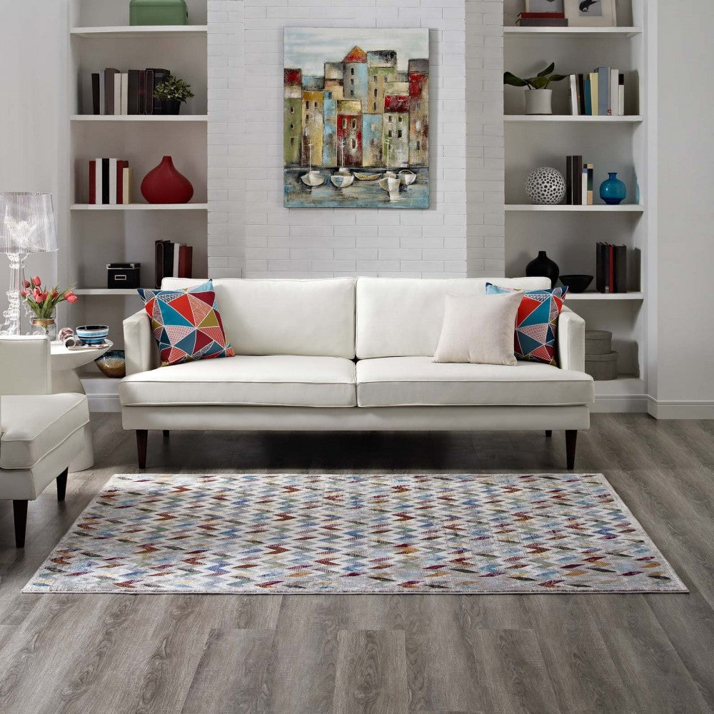Make a sophisticated statement with the Gemma Chevron Mosaic Area Rug. Patterned with a lively modern design, Gemma is a durable machine-woven polypropylene rug. Complete with a durable rubber bottom, Gemma enhances traditional and contemporary modern decors while outlasting everyday use. Featuring a colorful geometric design with a high density low pile weave and distressed effect, this non-shedding area rug is a perfect addition to the living room, bedroom, entryway, kitchen, dining room or family room. Gemma is a family-friendly stain resistant rug with easy maintenance. Vacuum regularly and spot clean with diluted soap or detergent as needed. Create a comfortable play area for kids and pets while protecting your floor from spills and heavy furniture with this carefree decor update for high traffic areas of your home.