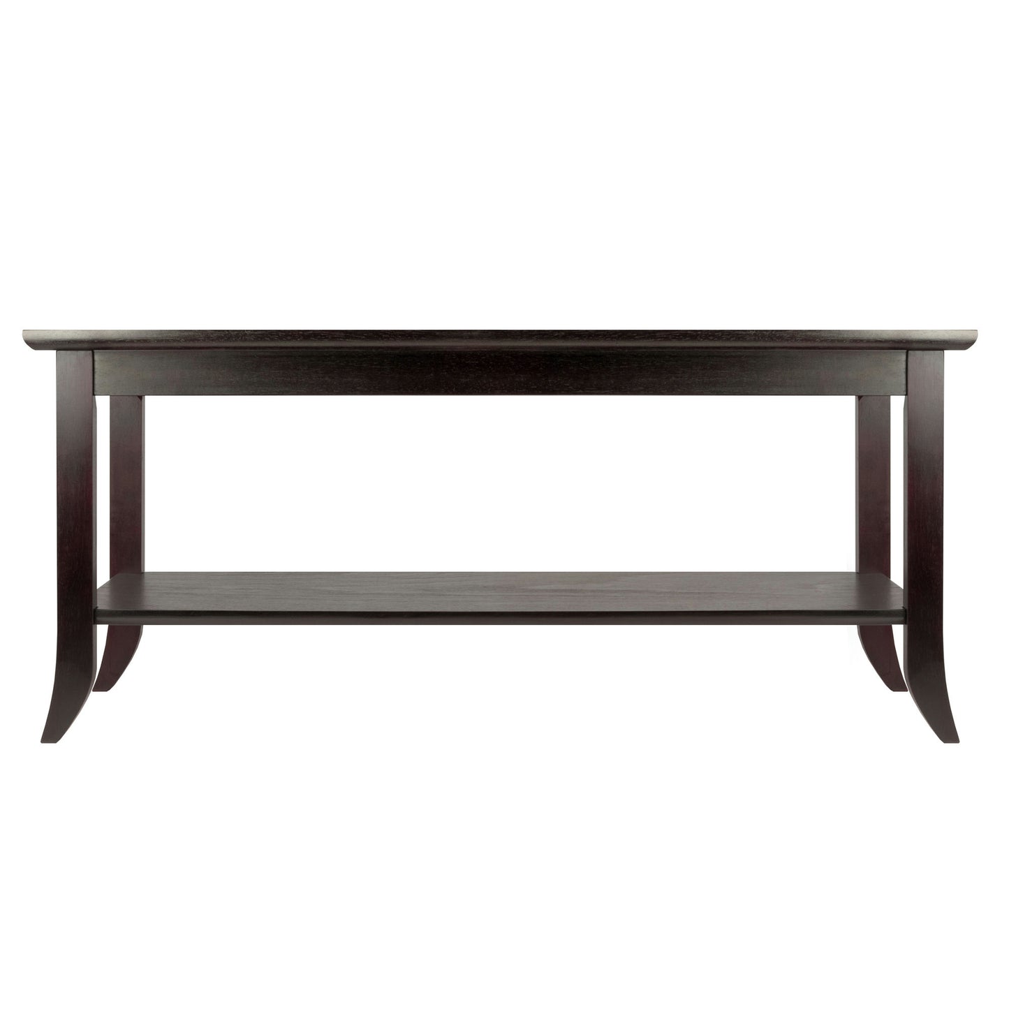Slightly flared legs and a tempered glass inset give the Genoa Rectangular Coffee Table a truly distinctive edge. A wide lower shelf provides plenty of space for books, magazines, or personal electronic devices. Made from solid and composite wood, this piece blends well with contemporary or transitional decor. Finished in a rich espresso.