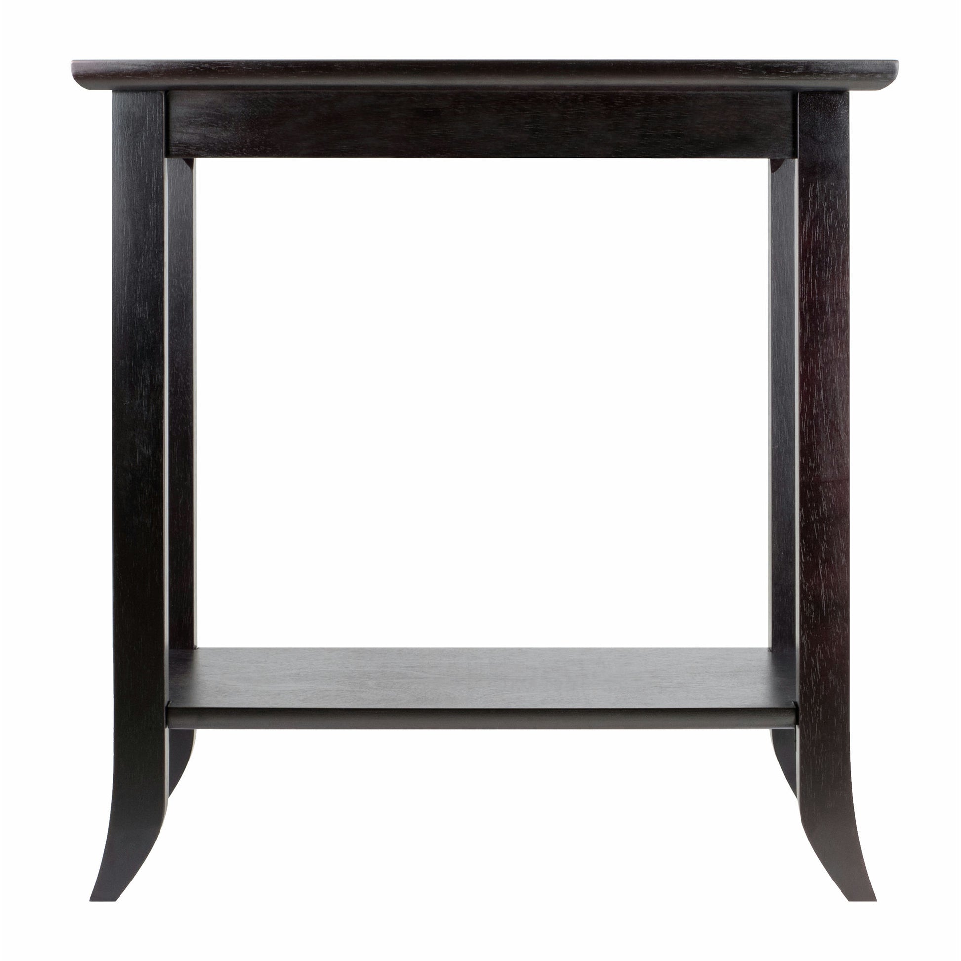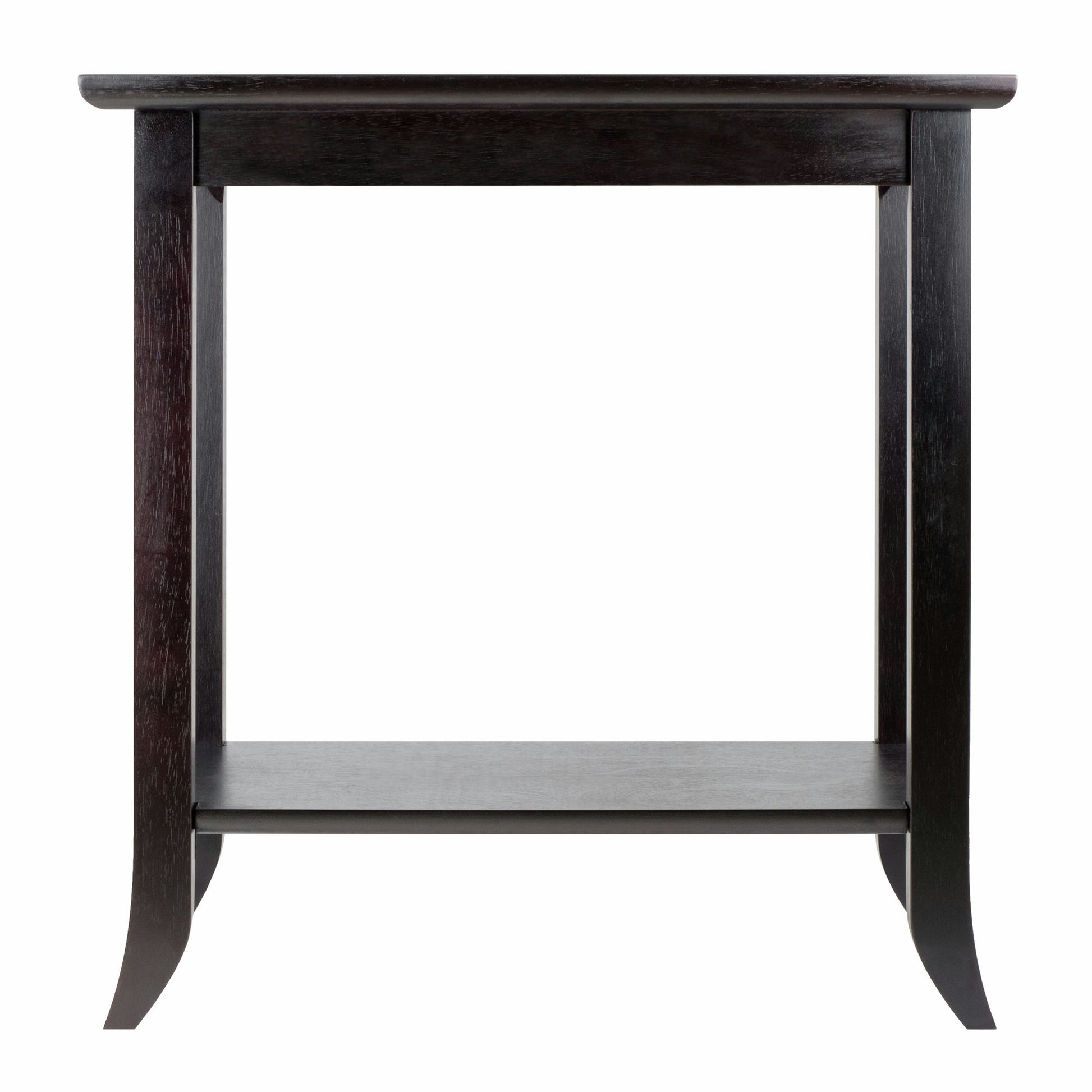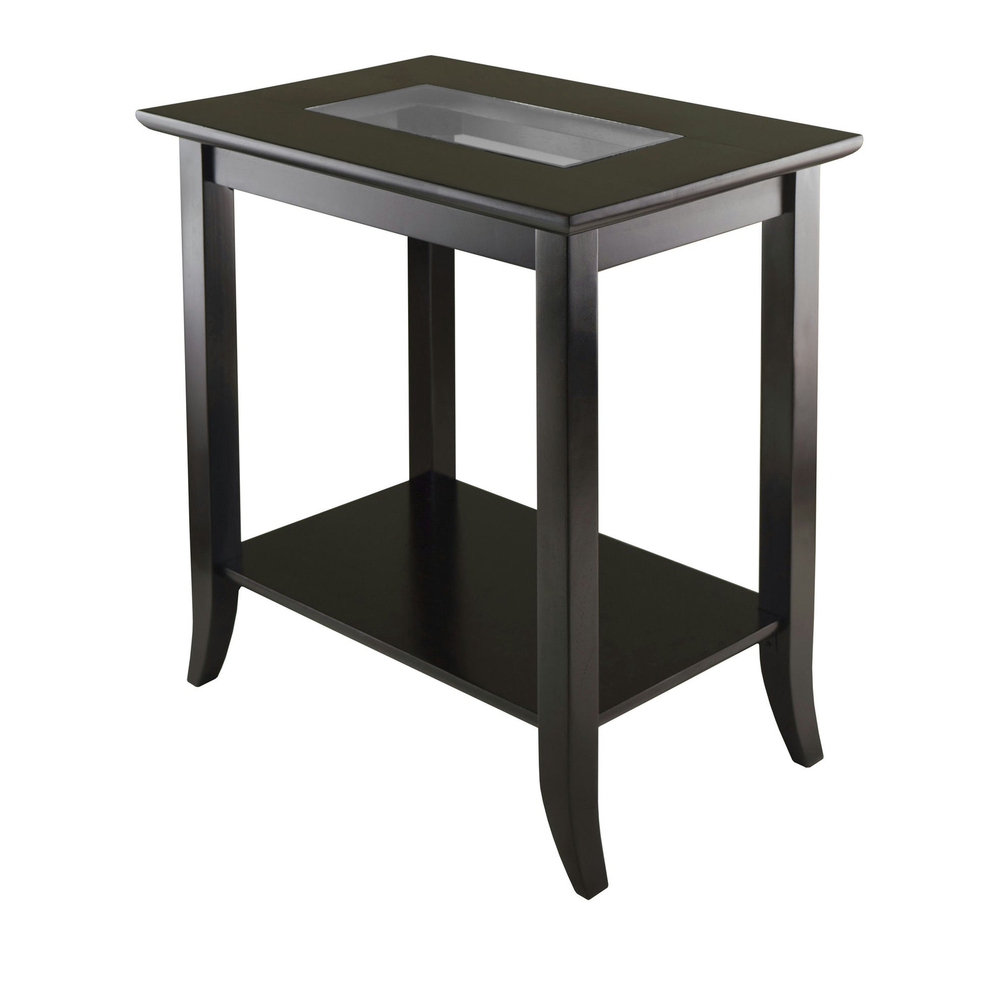 A tempered glass inset and flared legs give this wood side table a distinctive edge, and the rectangular shape provides an opportunity to position the table in two different ways. A lower shelf provides storage or display space. Finished in a rich espresso.