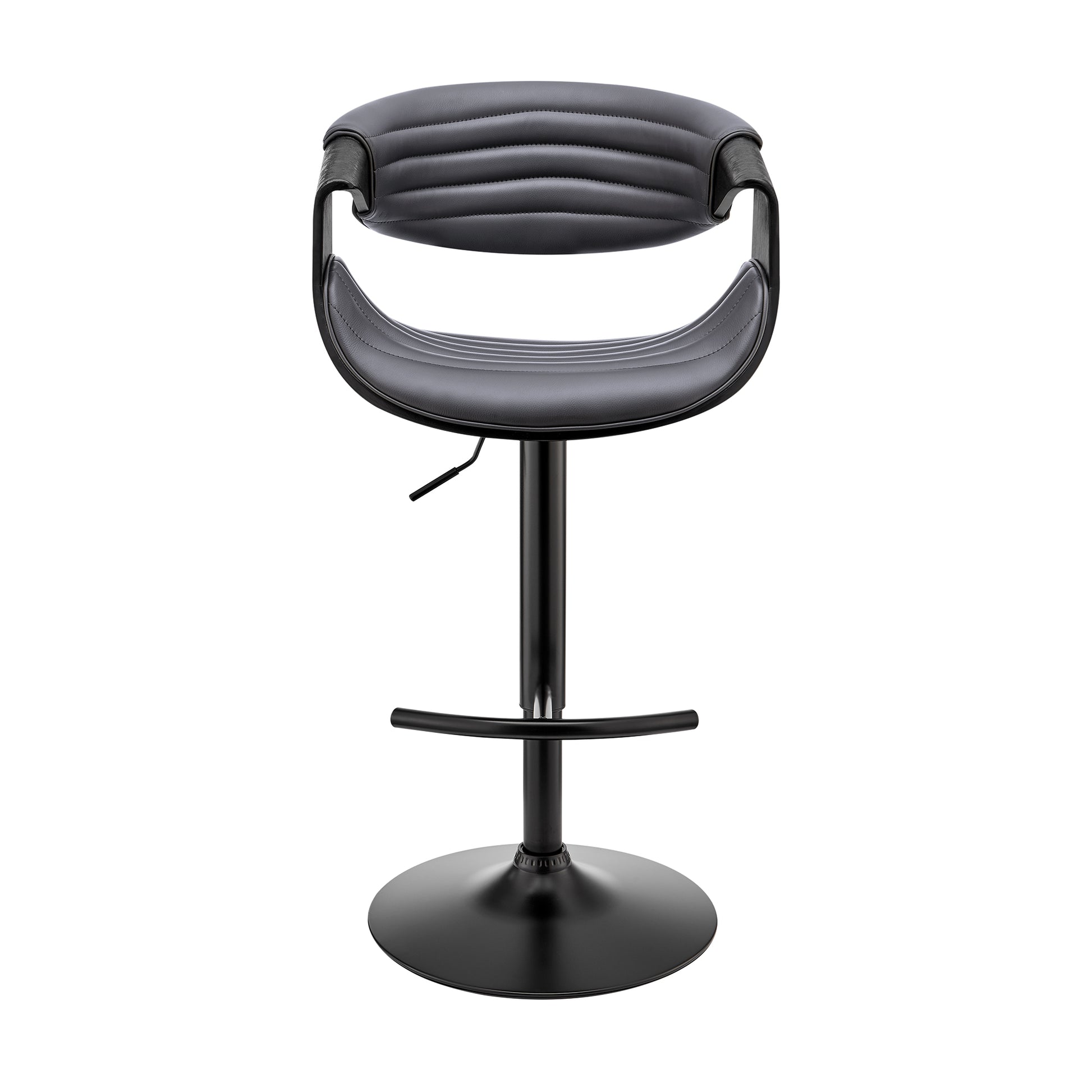 The Gionni Adjustable Swivel Gray Faux Leather and Black Wood Bar Stool with Black Base is an ideal addition to any home or apartment. The adjustable seat height functionality allows you to use this stool at your kitchen island, home bar, or peninsula without having to worry about the surface height. The convenient swivel function optimizes everyday use or entertaining, keeping everyone engaged regardless of their place in the room. The plush padded and high-density foam seat and back rest atop a strong pedestal base that creates a sturdy and comfortable seating experience. Wrapped in luxurious faux leather upholstery and complimented by beautiful wood accents, the Gionni stool has a mid-century silhouette exudes timeless beauty that will last for many years to come.