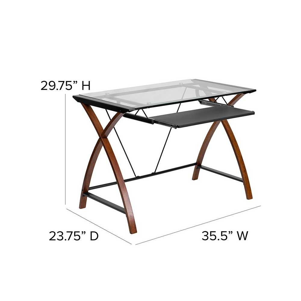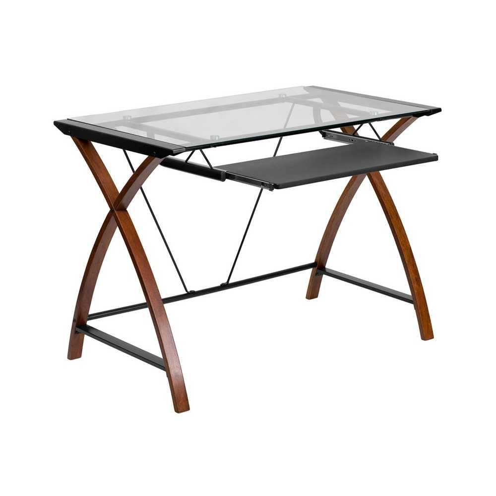 The contemporary design of this computer desk gives you a compact work space where you can use your computer and still have plenty of room for your paperwork and family photos. It features a clear tempered glass surface, a space-saving, sliding keyboard tray, and crisscross cherry finished legs. A powder coated finish protects the frame from scratches and floor glides protect your floor by sliding smoothly when you need to move the desk. This computer desk offers a practical option when you don't have a lot of space in your dorm room, home office or for a designated study area. [NAN-JN-2824S-GG]