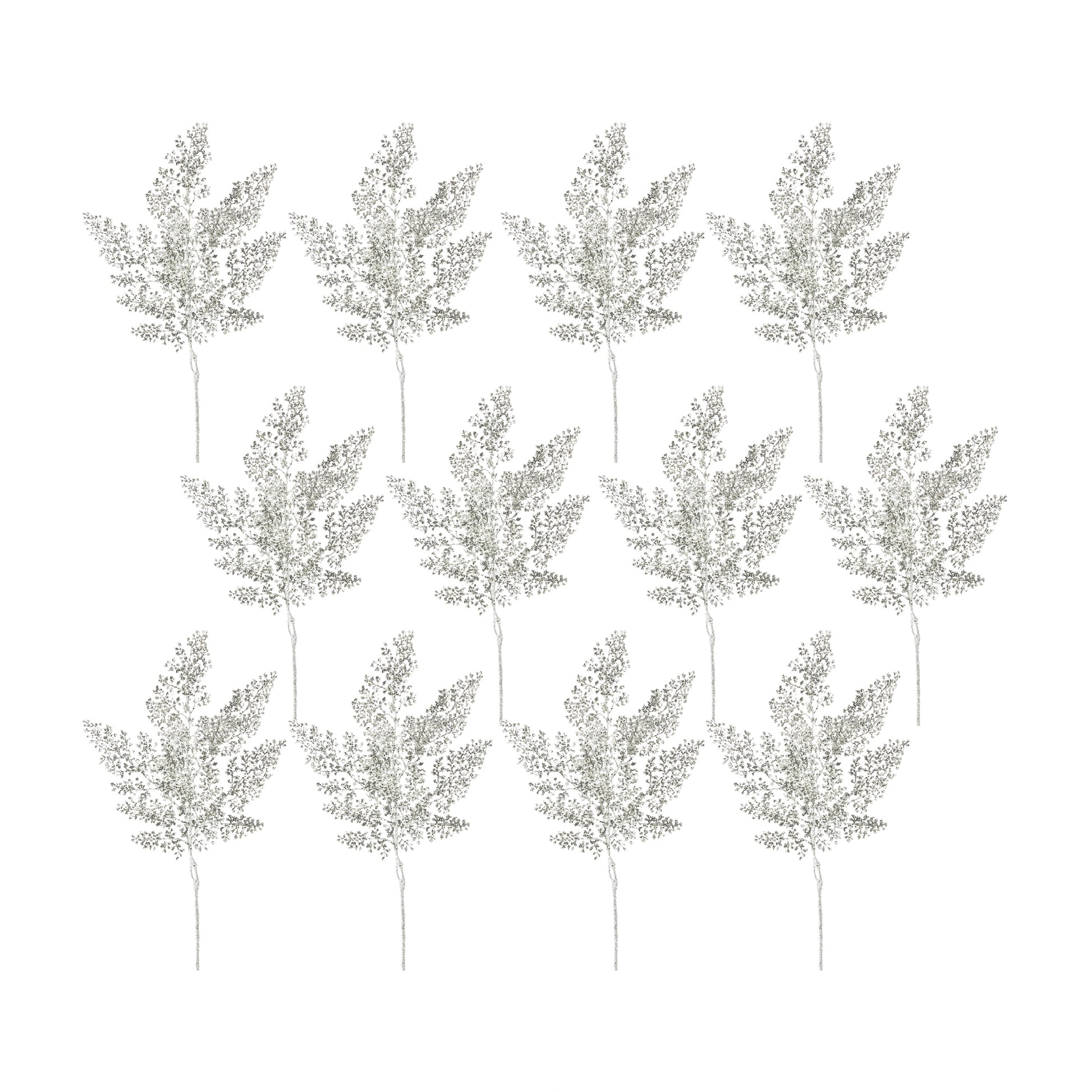 Add a touch of nature to your holiday decor with this beautiful set of Glitter Fern Sprays. Featuring twelve pieces, this set would make a great addition to your Christmas centerpiece or vase display. The realistic fern leaf design paired with the sparkley silver finish is the perfect combination to create a stunning display. The quality plastic components are sure to last for seasons to come.