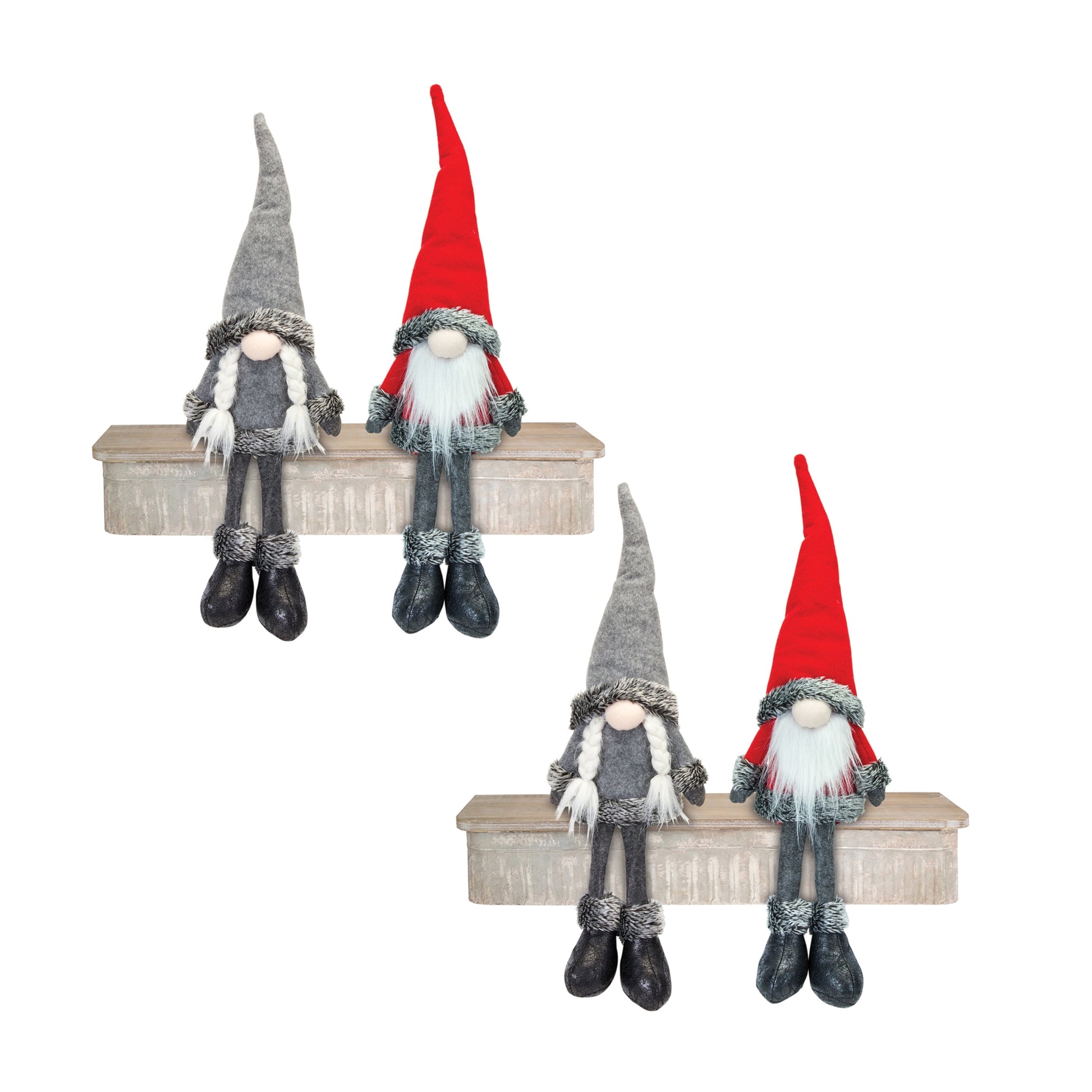Add a whimsical touch to your holiday home decor with this adorable set of Plush Gnome Shelf Sitters. Featuring two assorted designs and four total pieces, this set includes a man and woman gnome. The bright red and grey color scheme paired with the quality polyester composition makes this set a great addition to any style of Christmas decor . isplay the pieces together to make a statement, or display along with other decor to spread the holiday cheer.