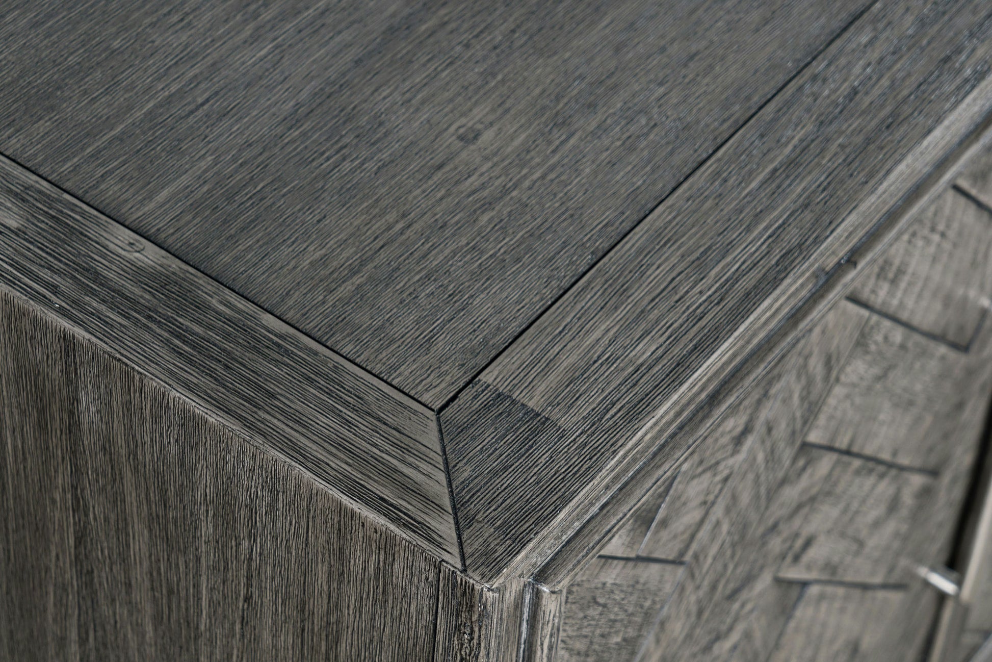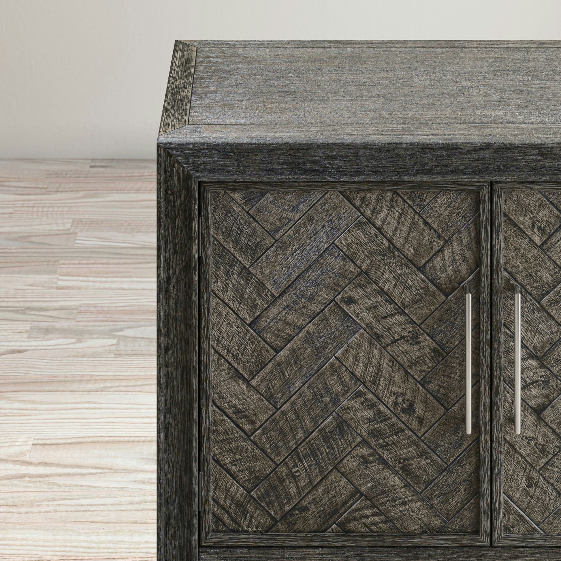 Skillfully crafted with exceptional Mid-Century Modern details, the Gramercy Four-Door Accent Storage Cabinet is the perfect addition to any living space. This beautiful piece of modern furniture is sure to captivate your attention with the sleek lines of a chevron pattern with stunning wire-brush distressing. The inner shelves are adjustable for plenty of flexible storage, and assembly is easy and fast using the available video tutorial. The vintage look makes this a centerpiece bar cabinet, or use it in your living room or dining room for additional space anywhere you need it.