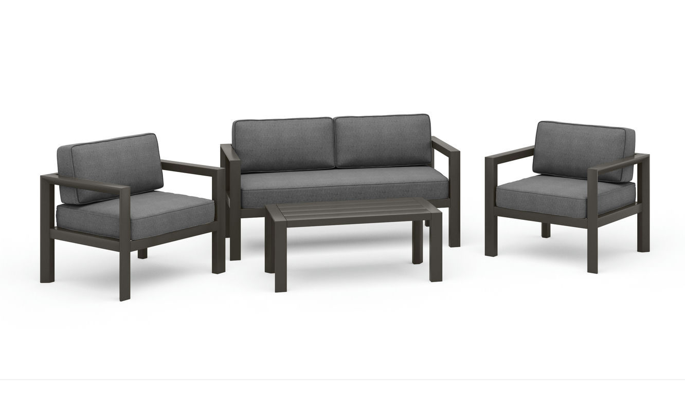 Outdoor spaces become as comfy and cozy as a living room when you add a Homestyles Grayton Outdoor 4-Piece Set. With a two-seat loveseat, two chairs and a coffee table, you can pull up to five people together to enjoy great company and even greater comfort. Recycled aluminum frames with stainless steel hardware and weather-resistant cushions make this an outdoor collection for all seasons, year after year.