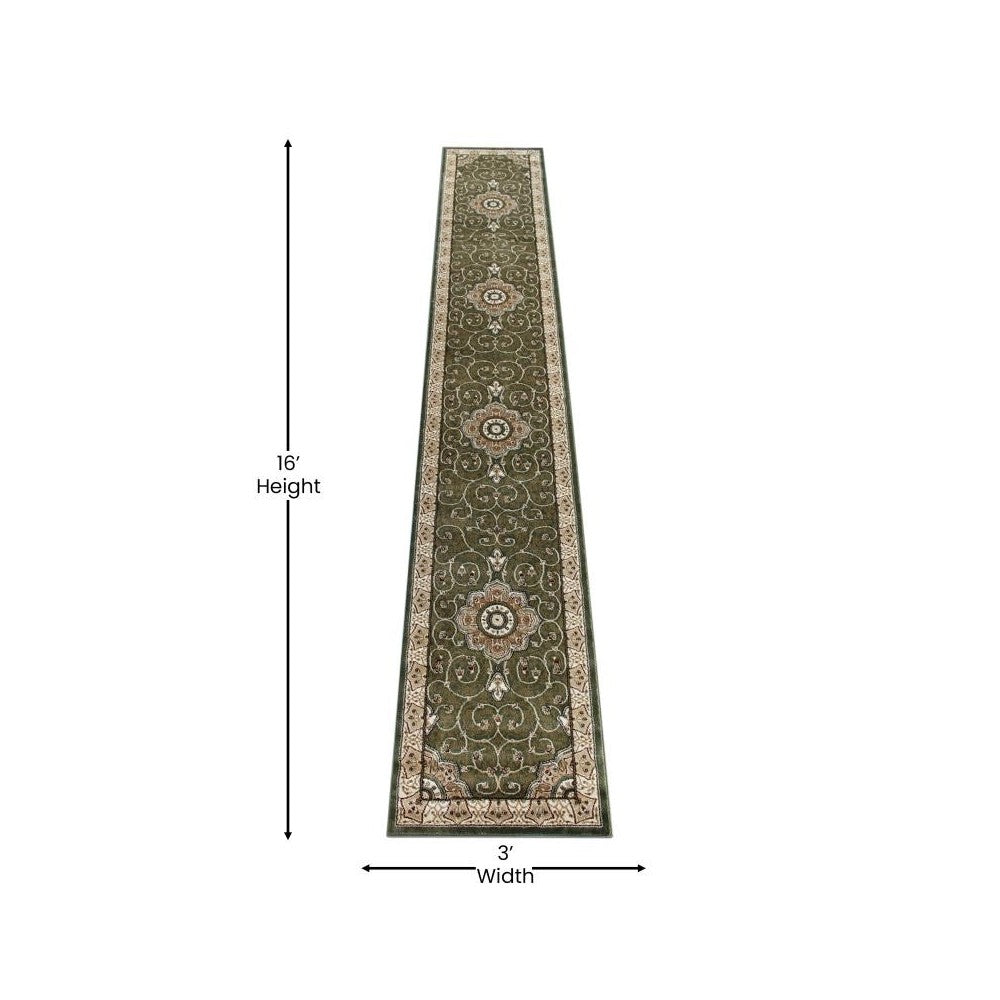 Give any room in your home its own style or help tie them into the look of the rest of your home design with this Persian style runner rug. The versatility of this traditional area rug allows you to add warmth to hardwood floors, dimension to narrow rooms, and protect flooring in high-traffic areas. This low pile area rug can be used in open floor plans to define conversation and dining areas. Indoor rugs have many benefits for the modern home. Made from olefin fibers, these contemporary runner rugs are water resistant, colorfast, and provide a soft underfoot feel friendly to kids and pets. The jute backing gives this rug structural integrity and helps promote air flow. Vacuum regularly without the beater bar and spot clean with water and a mild detergent to maintain the look of your new rug. [NR-RGB404-315-GN-GG]