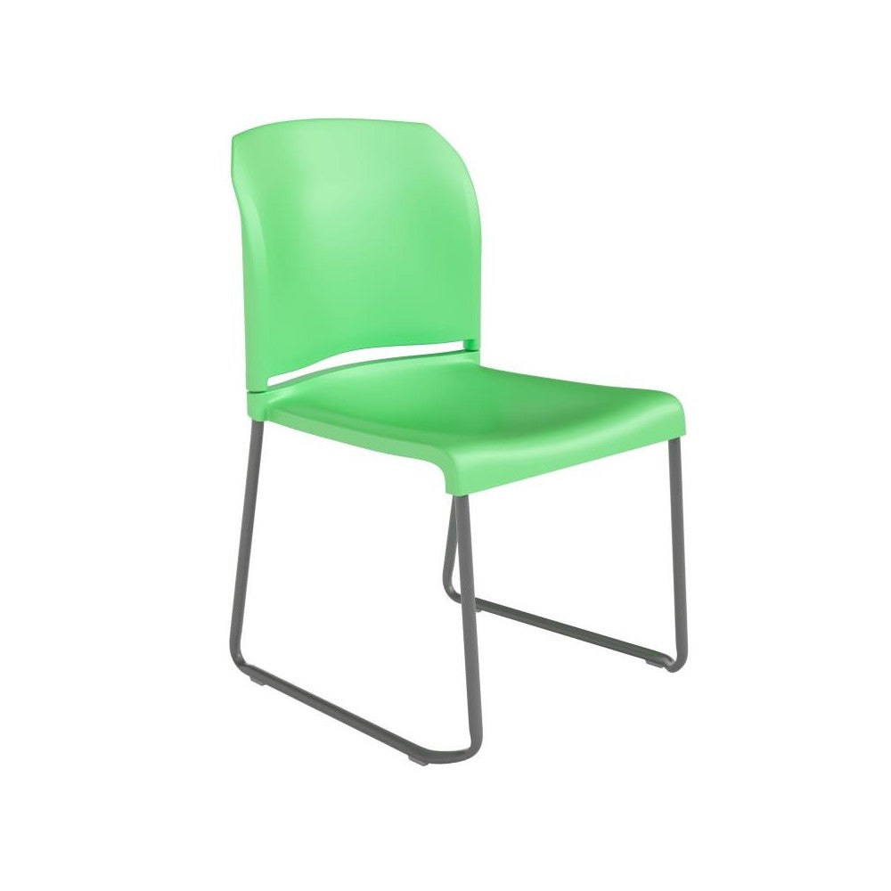 Provide comfortable seating in your lobby, cafeteria, breakroom, auditorium or office with this appealing sled base stack chair. Plastic stack chairs are popular chairs for temporary or permanent seating solutions and are ready-to-use with a fully assembled design. The green powder coated sled base chair is stylish enough to be used as your modern dining chair and are easy to clean. Create an engaging atmosphere by using different colors in your training room or open workspace. Working in open industrial style offices can be distressing, adding colorful stack chairs around collaborative tables can make the space fun and inviting. These stackable guest chairs are designed to withstand constant use to keep up with the daily demands of your business. For transporting efficiency acquire our steel stack chair dolly. [RUT-238A-GN-GG]