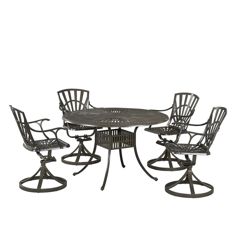 Create paradise in your own backyard. This Grenada 5-piece Dining Set by homestyles has a cast aluminum frame and is UV-resistant, with a hand-applied, powder-coated finish that's sealed with a clear coat. The set includes a 48"D table and four swivel chairs for gathering with friends and family. Chairs rotate 360 degrees and rock, providing total freedom of movement. The seat design prevents water from collecting. There is an umbrella hole, with a cap when not in use. Nylon glides keep the pieces firmly in place and all hardware is rust-proof stainless steel.
