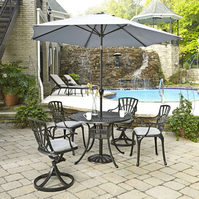 The Grenada Patio Collection will help you create paradise in your own backyard. This 6-piece dining group includes a 42"D table, two swivel chairs and two arm chairs with cushions, and an umbrella with stand to bring any small group closer together. The table and chairs feature a UV-resistant cast aluminum frame, with a hand-applied powder-coated finish that is sealed with a clear coat for completely worry-free maintenance. The umbrella includes a tilt mechanism to provide continuous shade where needed, and a cast iron base provides excellent stability.