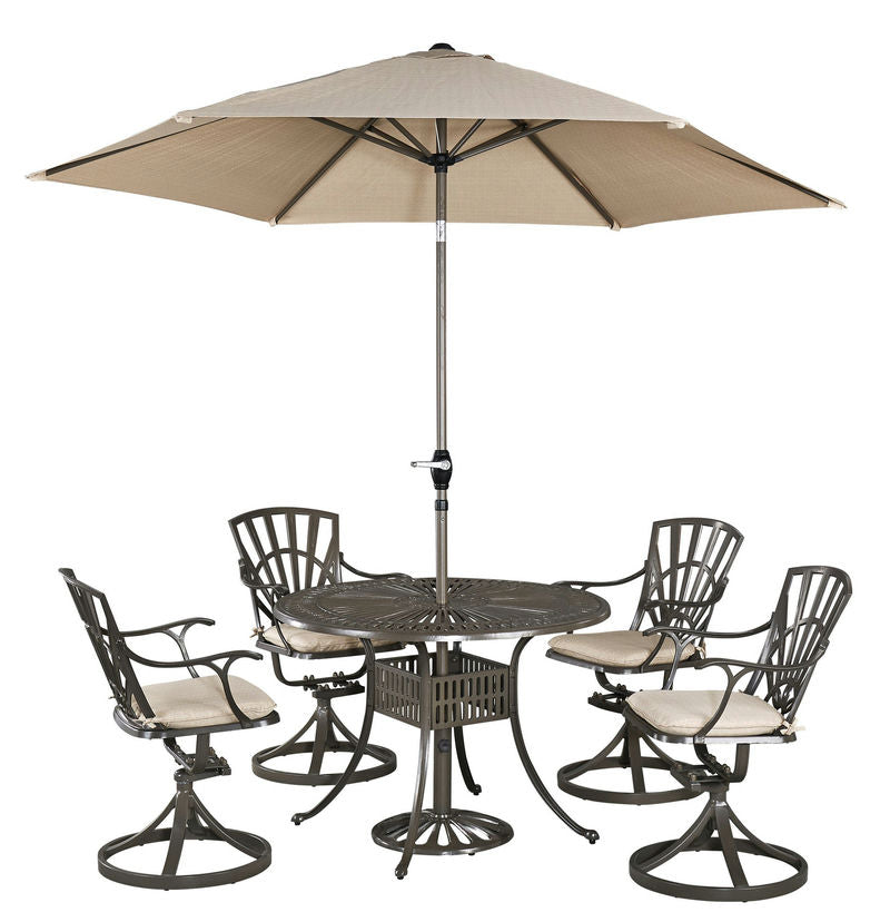 This Grenada 7-piece dining group includes a 42"D table, four swivel chairs with cushions, and an umbrella with stand. The table and chairs feature a UV-resistant cast aluminum frame, with a hand-applied powder-coated finish that is sealed with a clear coat. The umbrella includes a tilt mechanism.