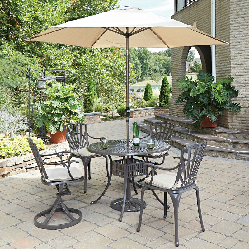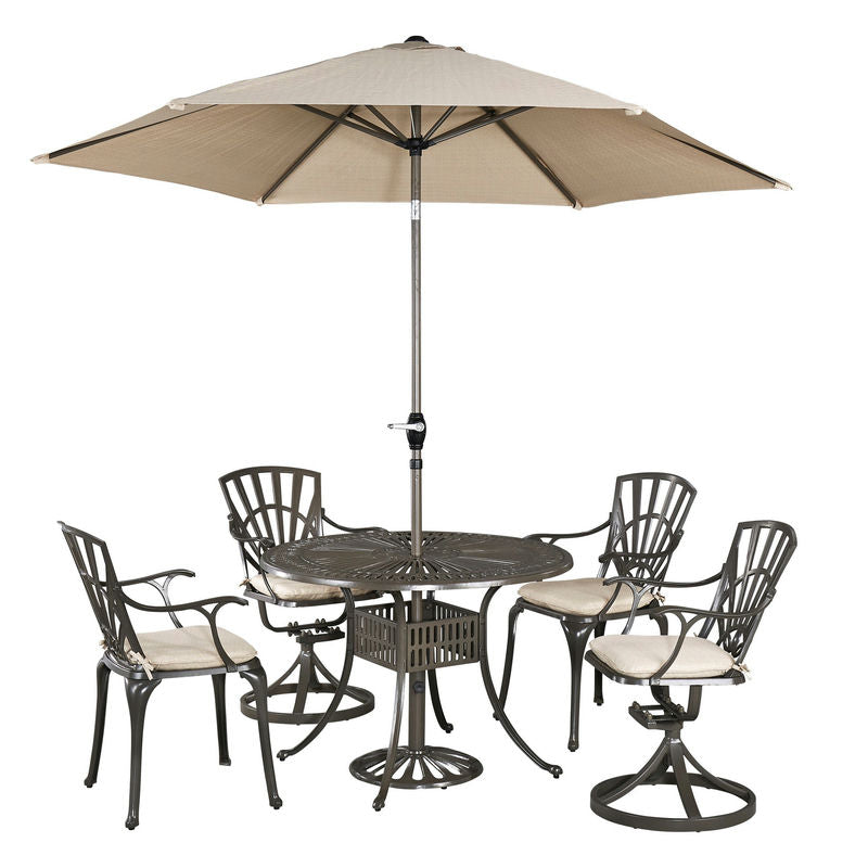The Grenada Patio Collection will help you create paradise in your own backyard. This 6-piece dining group includes a 42"D table, two swivel chairs and two arm chairs with cushions, and an umbrella with stand to bring any small group closer together. The table and chairs feature a UV-resistant cast aluminum frame, with a hand-applied powder-coated finish that is sealed with a clear coat for completely worry-free maintenance. The umbrella includes a tilt mechanism to provide continuous shade where needed, and a cast iron base provides excellent stability.