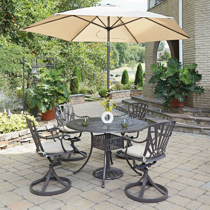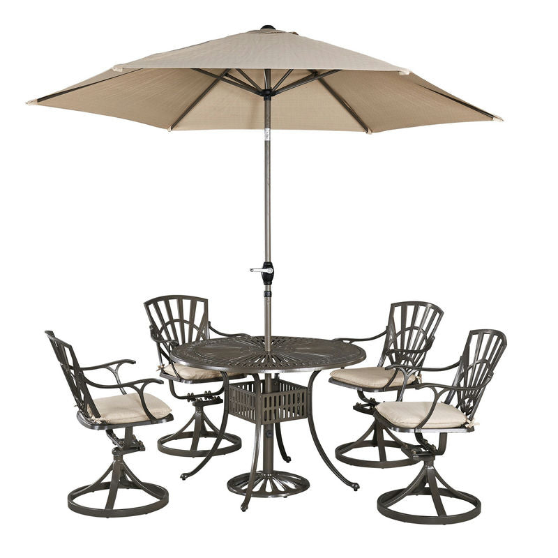 This Grenada 7-piece dining group includes a 48"D table, four swivel chairs with cushions, and an umbrella with stand. The table and chairs feature a UV-resistant cast aluminum frame, with a hand-applied powder-coated finish that is sealed with a clear coat. The umbrella includes a tilt mechanism.