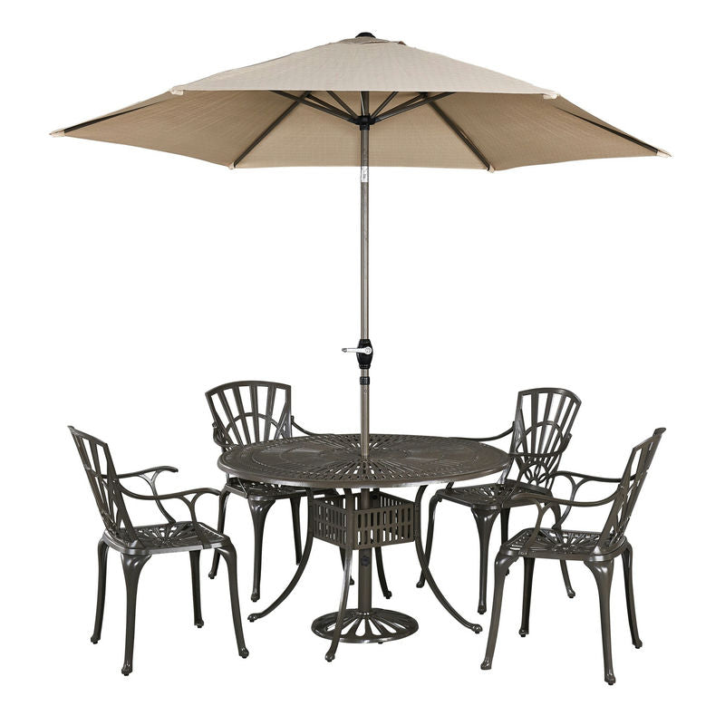 Create paradise in your own backyard. This Grenada 6-piece Dining Set by homestyles has a cast aluminum frame and is UV-resistant, with a hand-applied, powder-coated finish that's sealed with a clear coat. The set includes a 48"D table, four arm chairs and an umbrella with stand for gathering with friends and family. The chair design prevents water from collecting. The umbrella includes a tilt mechanism to provide continuous shade where needed, and a cast iron base provides excellent stability. Nylon glides keep the pieces firmly in place and all hardware is rust-proof stainless steel.