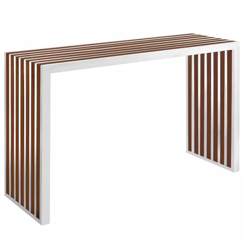 The conduit design of this Gridiron series installment artfully blends stainless steel tubing with mahogany varnished poplar wood slats. Modernism used to be about extremes. Wild shapes and patterns that don"™t dare resemble its predecessors. We"™ve reached an age of maturity of sorts. We appreciate style, but all the more, we respect those designs that represent a blending of cultures. The Gridiron steel and wood panel bench is famous not for its radical shape, but for the strategic transcendence that it provides. Gridiron is perfect for reception rooms, living and lounge areas, and any other place in need of transformation.