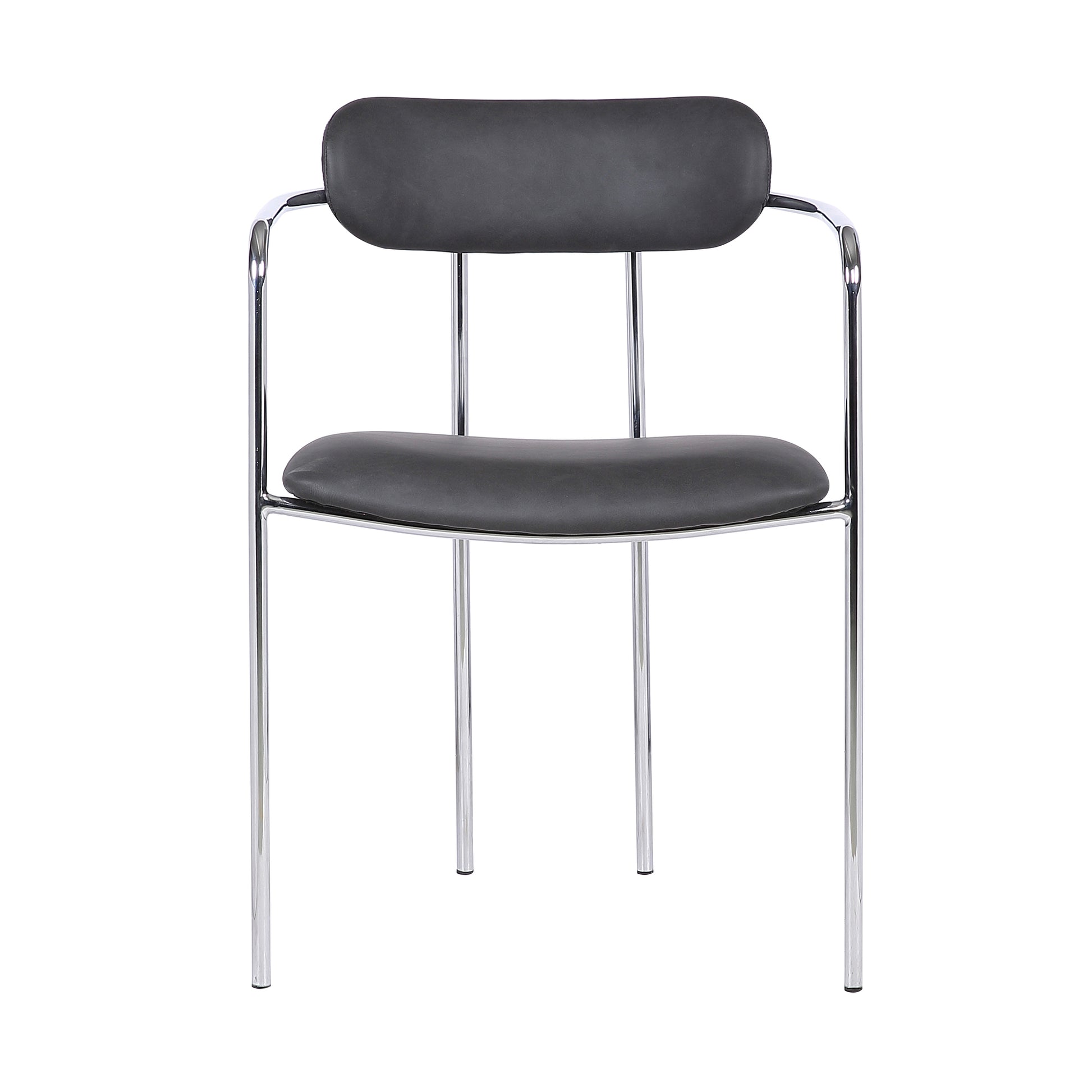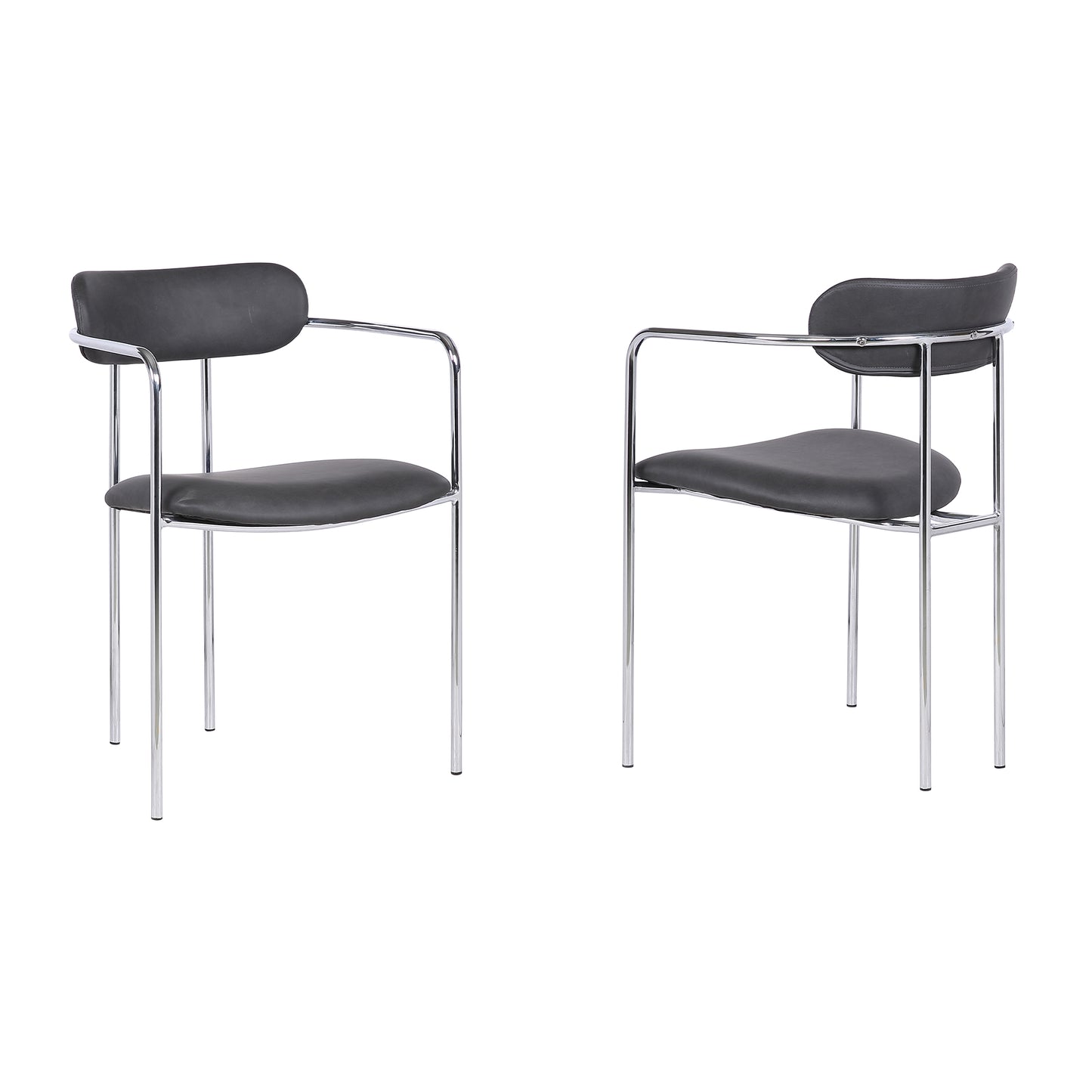 The Armen Living Gwen contemporary dining chair features a futuristic Chrome Steel frame that is in keeping with modern design sentiments. An excellent dining room choice, the Gwen features a foam padded, Gray Faux Leather upholstered seat and backrest that offer an ideal level of user support. The chair's unique arms act as great aesthetic accents, giving the chair a truly impressive look and feel. The Gwen's legs are tipped with rubber floor protectors, assuring that the Gwen will not damage hardwood or tile floors, even when dragged. The exquisite Gwen is sold in a set of 2 and is certain to leave you feeling satisfied.