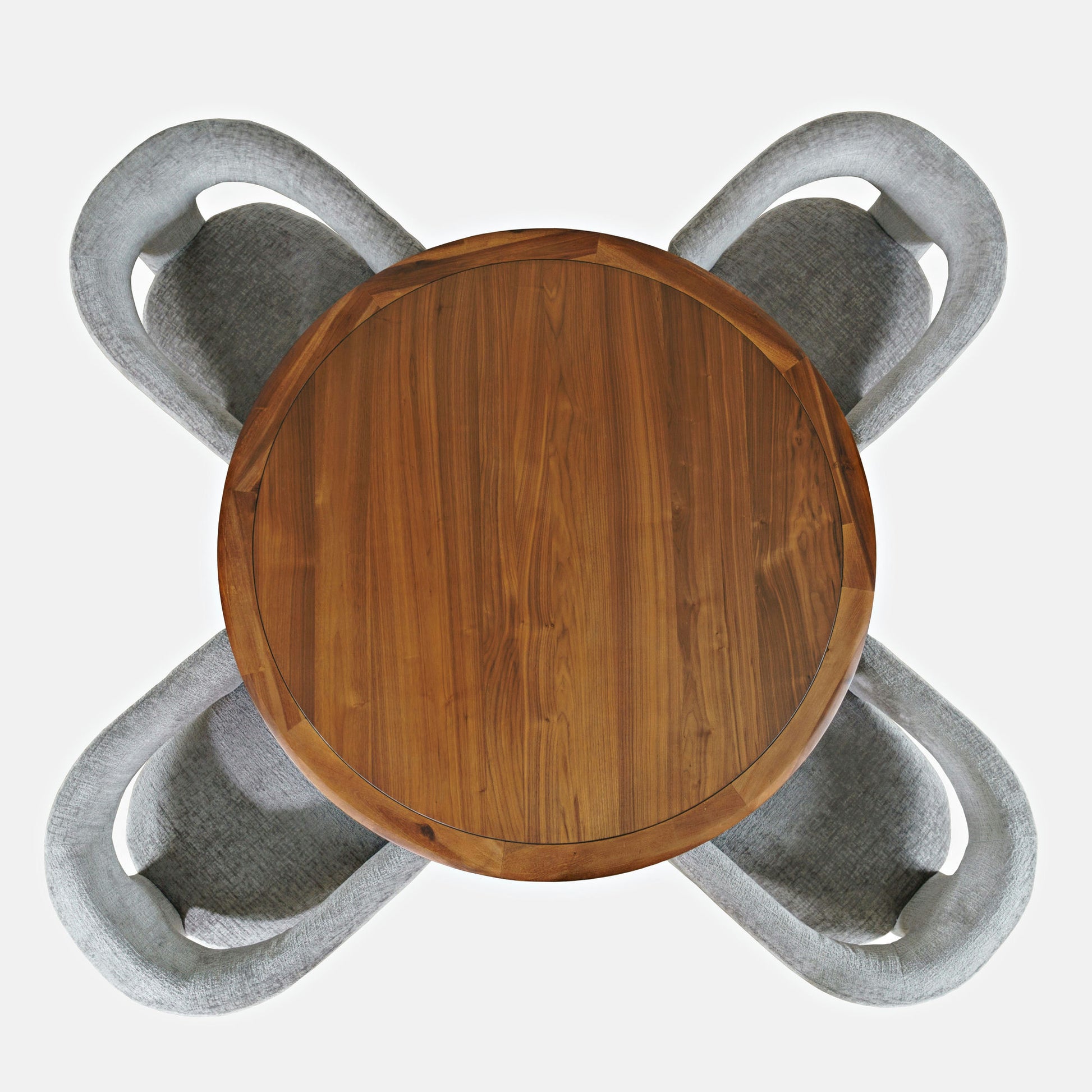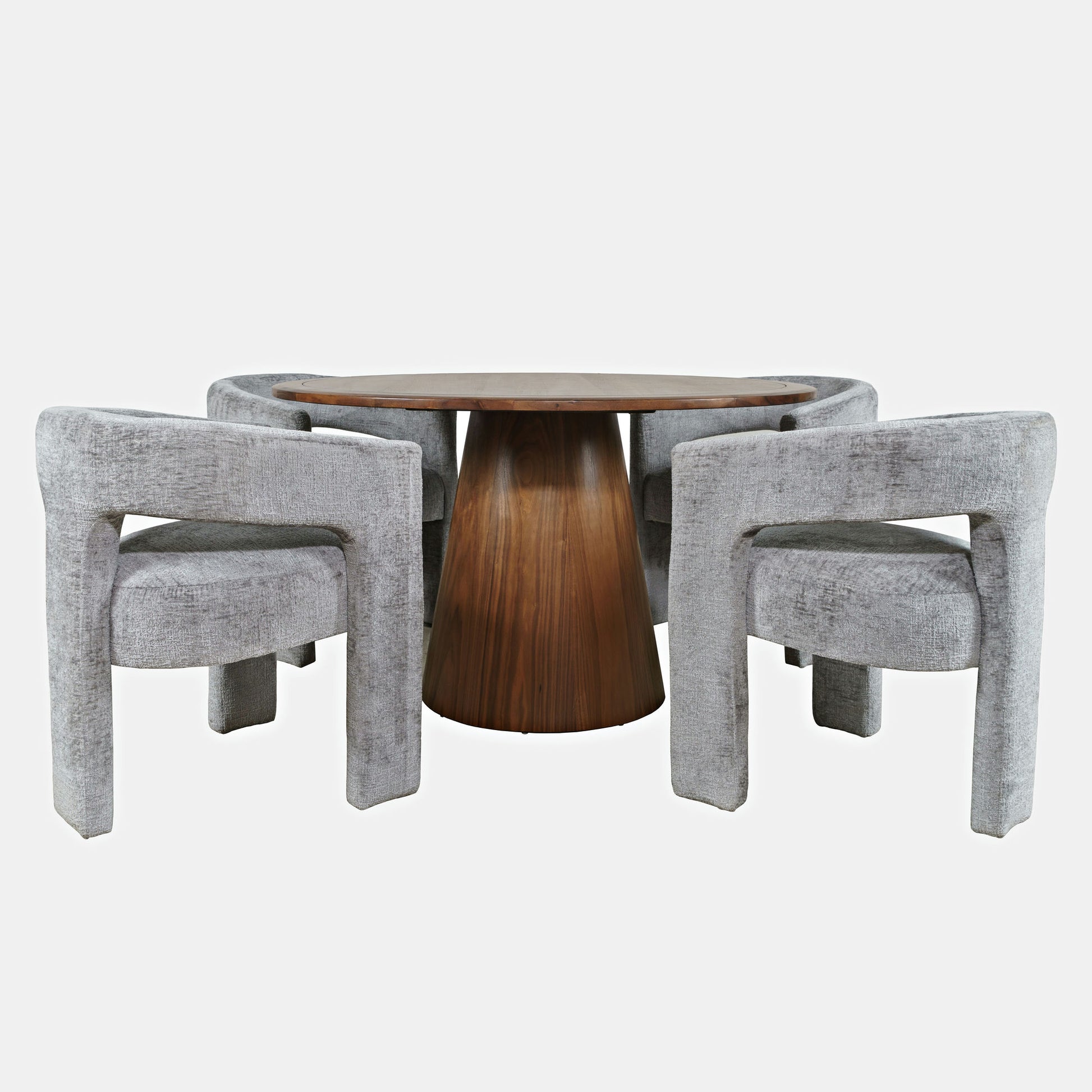 Upgrade your home with the stunningly beautiful Gwen Luxury Mid-Century Modern Five Piece Dining Set. The set includes four matching upholstered dining chairs with plush Jacquard fabric, and a 50 inch modern pedestal dining table. The rounded back with integrated arms offers both flexibility and functionality, making it ideal for use as an accent chair in your living room or as guest seating in your dining room. Crafted with a mid-century modern tapered base and a rich walnut brown finish, the dining table exudes sophistication and elegance. The minimalist design features an enticing curved silhouette that seamlessly blends modern simplicity with daily functionality, perfect for weekday dinners with family or game night with friends.