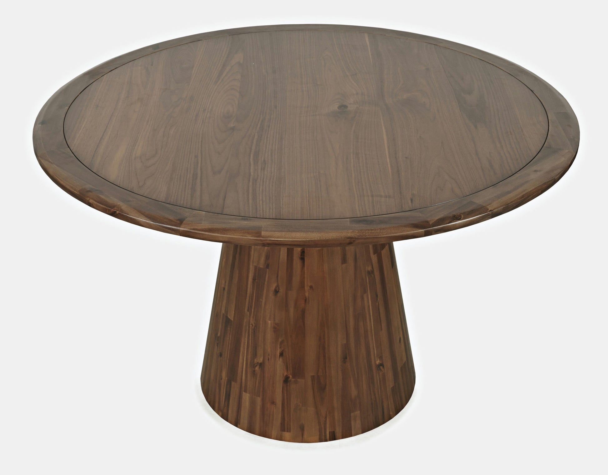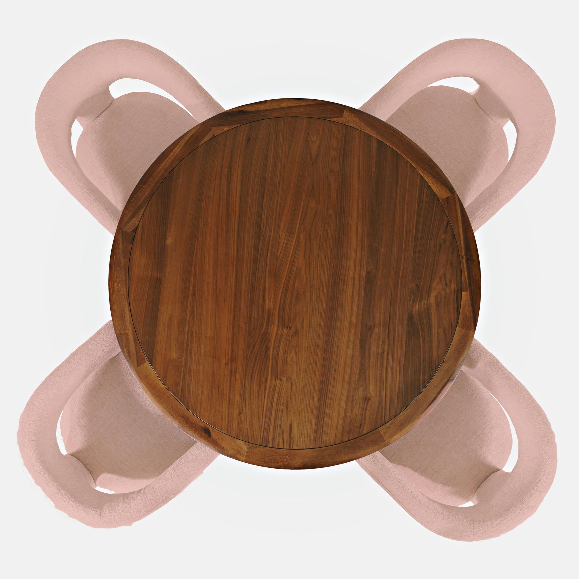 Upgrade your home with the stunningly beautiful Gwen Luxury Mid-Century Modern Five Piece Dining Set. The set includes four matching upholstered dining chairs with plush Jacquard fabric, and a 50 inch modern pedestal dining table. The rounded back with integrated arms offers both flexibility and functionality, making it ideal for use as an accent chair in your living room or as guest seating in your dining room. Crafted with a mid-century modern tapered base and a rich walnut brown finish, the dining table exudes sophistication and elegance. The minimalist design features an enticing curved silhouette that seamlessly blends modern simplicity with daily functionality, perfect for weekday dinners with family or game night with friends