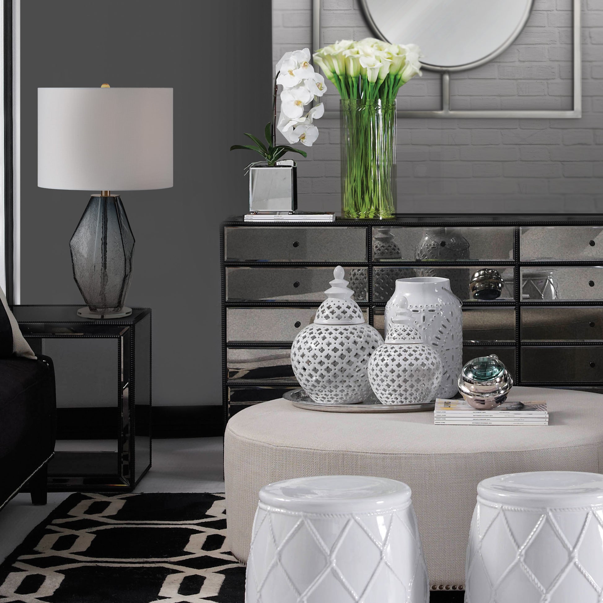 A soft white linen shade provides beautiful contrast to the smoke gray glass base of this modern table lamp. The organic shape of the lamp base mimics rock crystal for a look that's equal parts opulent and organic.
