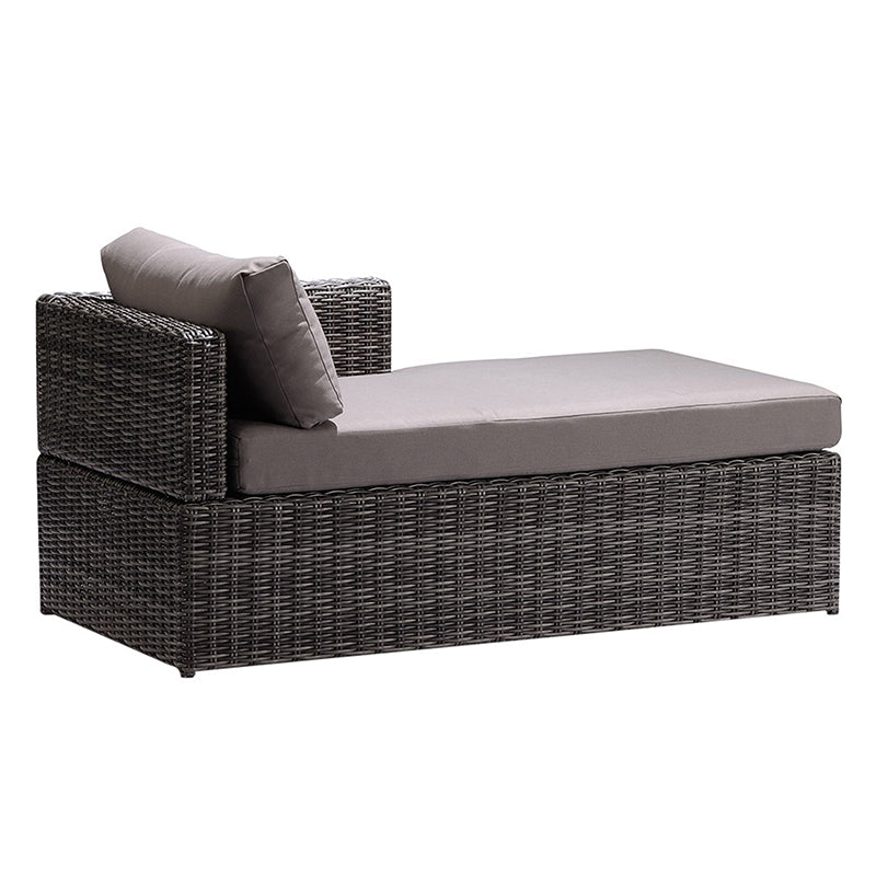The Armen Living Hagen contemporary sectional chaise set is a truly original assemblage of both aesthetically pleasing and comfortable outdoor pieces. The patio set includes a chic and luxurious sun lounger, a sleek modern coffee table, and a plush left double corner sofa. The included sofa is made up of doll cotton cushions and accented with a plush fabric pillow with circular designs for added comfort and sophistication. Taken as a whole, the Hagen set is a beautiful addition to any patio or living room. Taken individually, the furnishings included can act as additional seating in any room of the house.