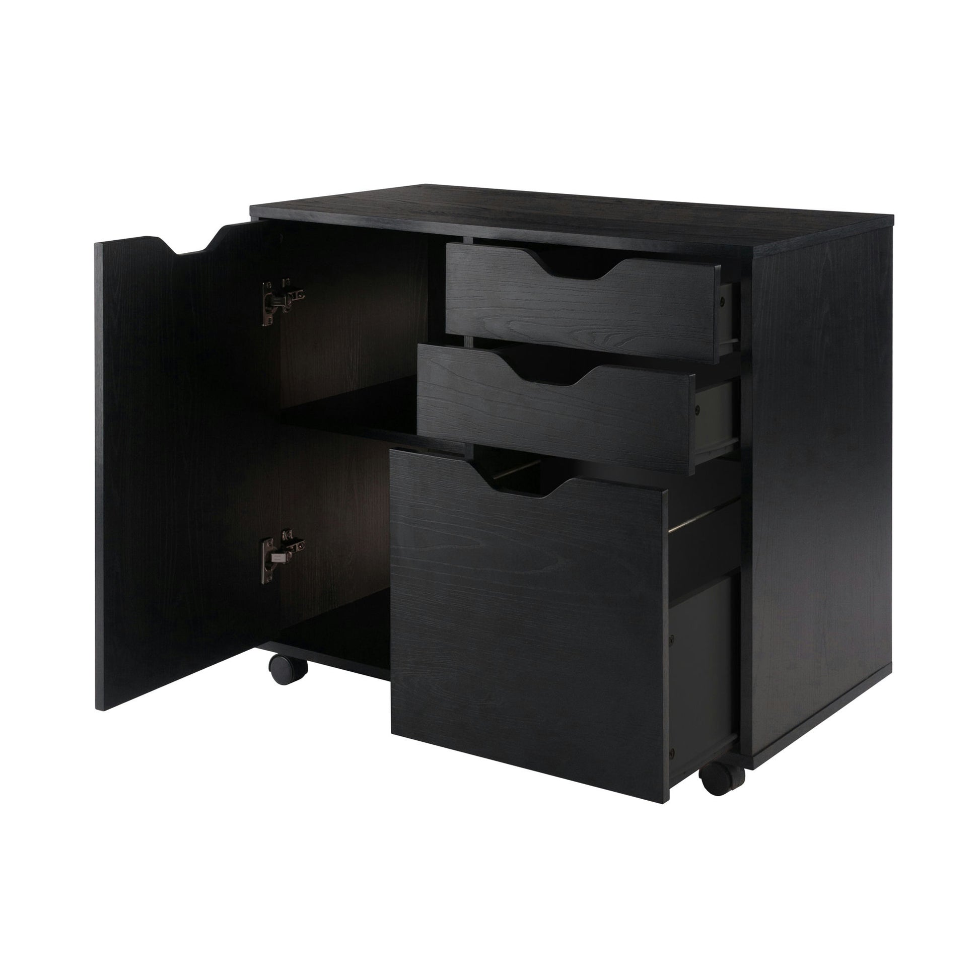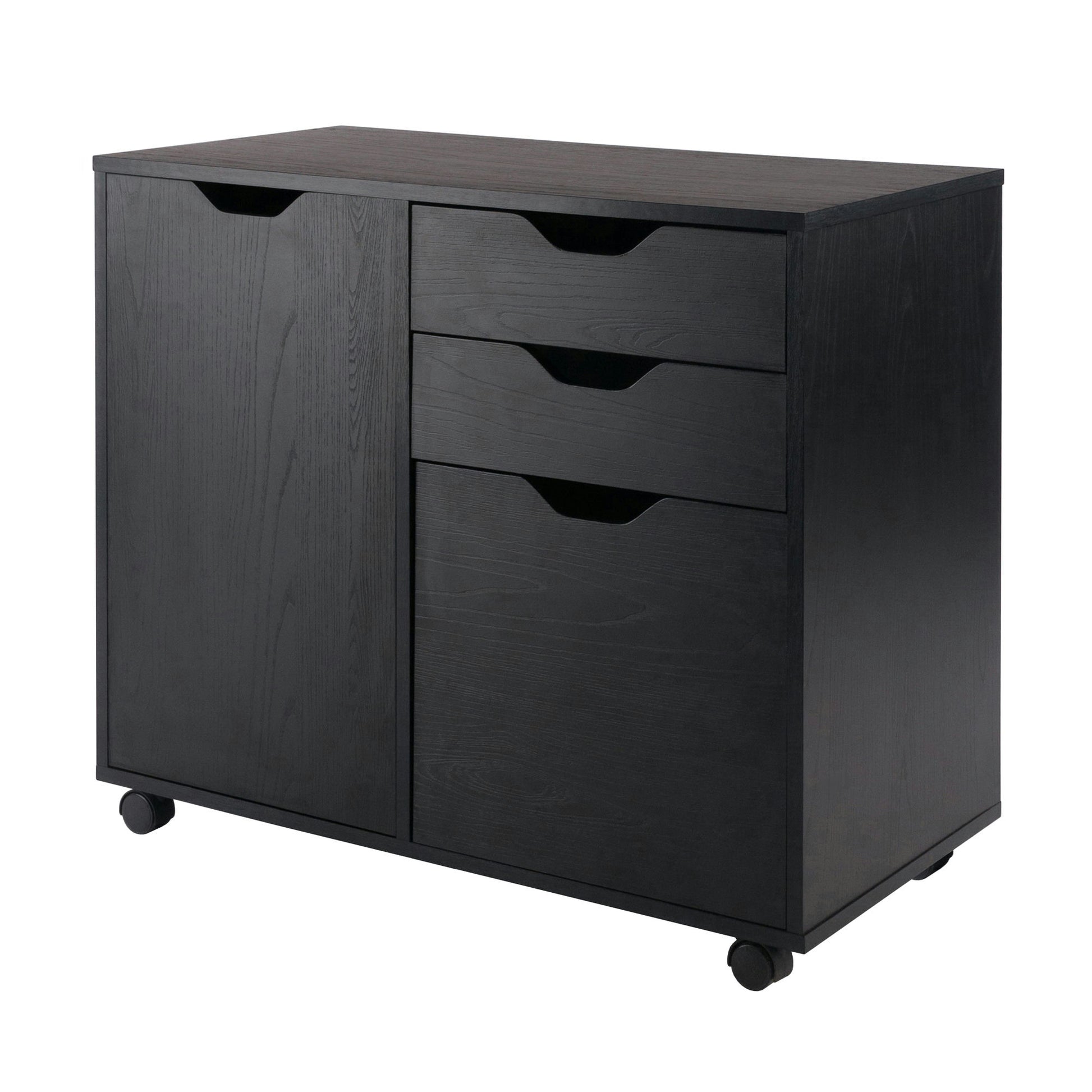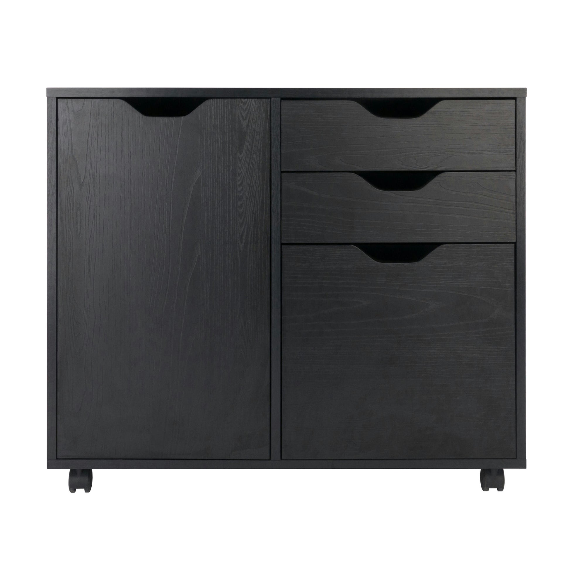 Simple and practical, with a contemporary look, the Halifax 2-Section Filing Cabinet is the answer for organizing your home office. Or use this versatile storage unit for craft supplies, shoes and clothing, sporting gear, and much more. With two drawers plus a convertible file drawer and a tall cabinet with door and adjustable shelf, this mobile storage piece is the perfect organizational tool for your home. Made of sturdy composite wood in a contemporary black finish.