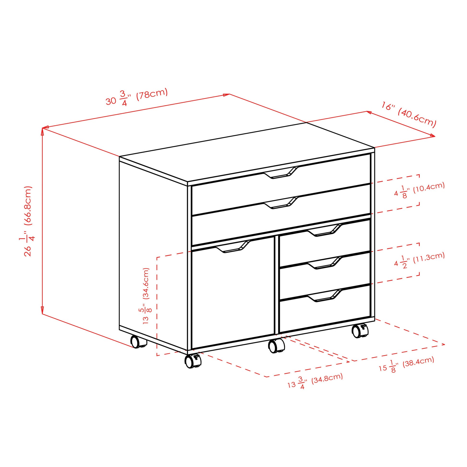 - 2 wide upper drawers; 3 lower drawers