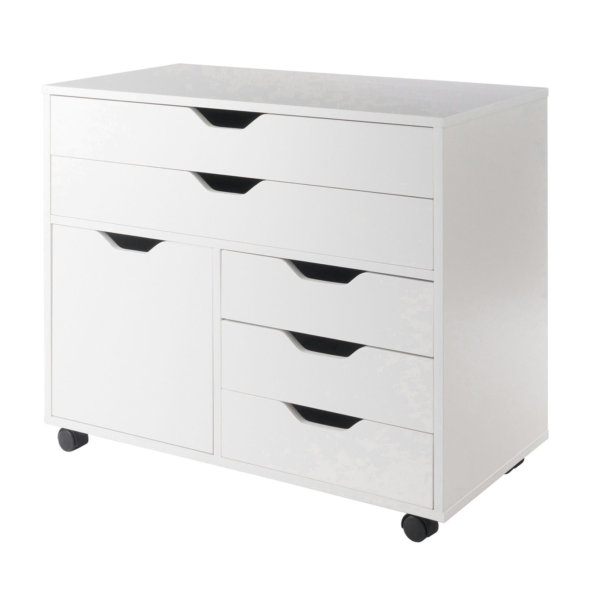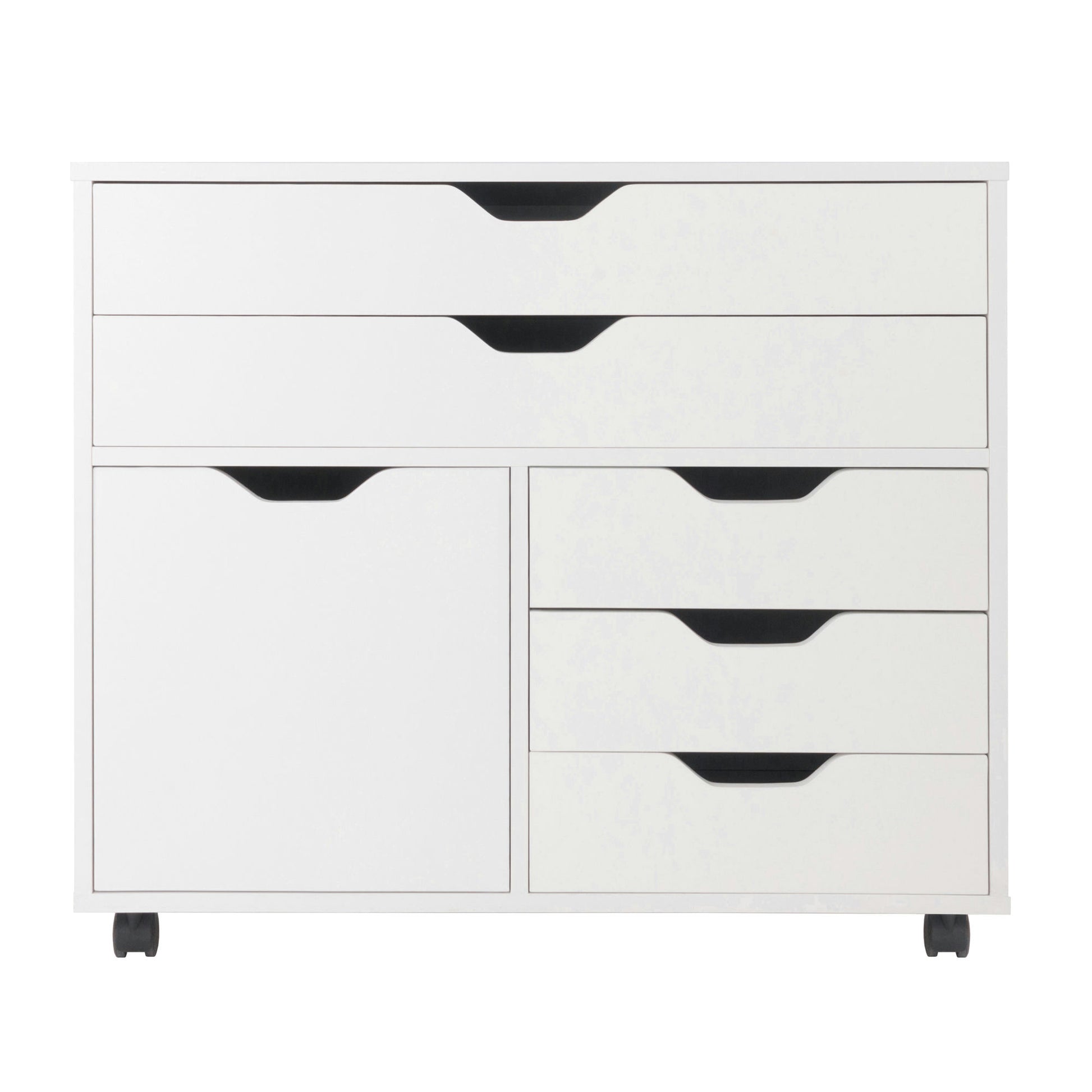 Simple and practical, with a contemporary look, the Halifax 3-Section Cabinet is the answer for organizing your office supplies, tools, craft materials, linens, and much more. With five drawers plus a sizeable cabinet, this mobile unit is the perfect organizational tool for your home. Made of sturdy composite wood in a clean white finish.