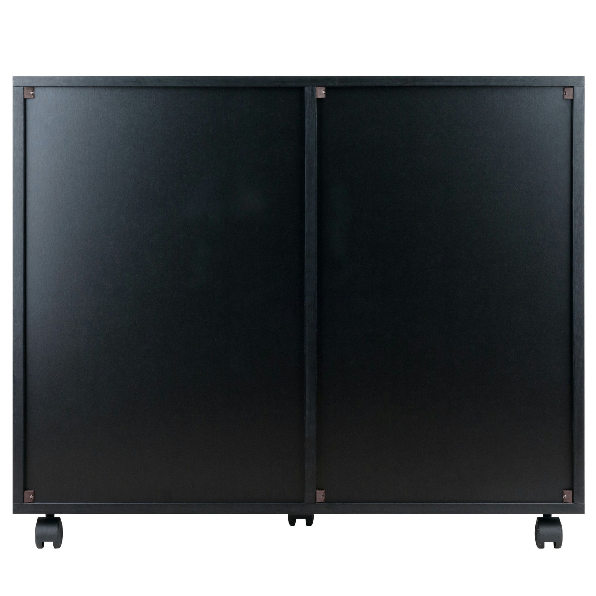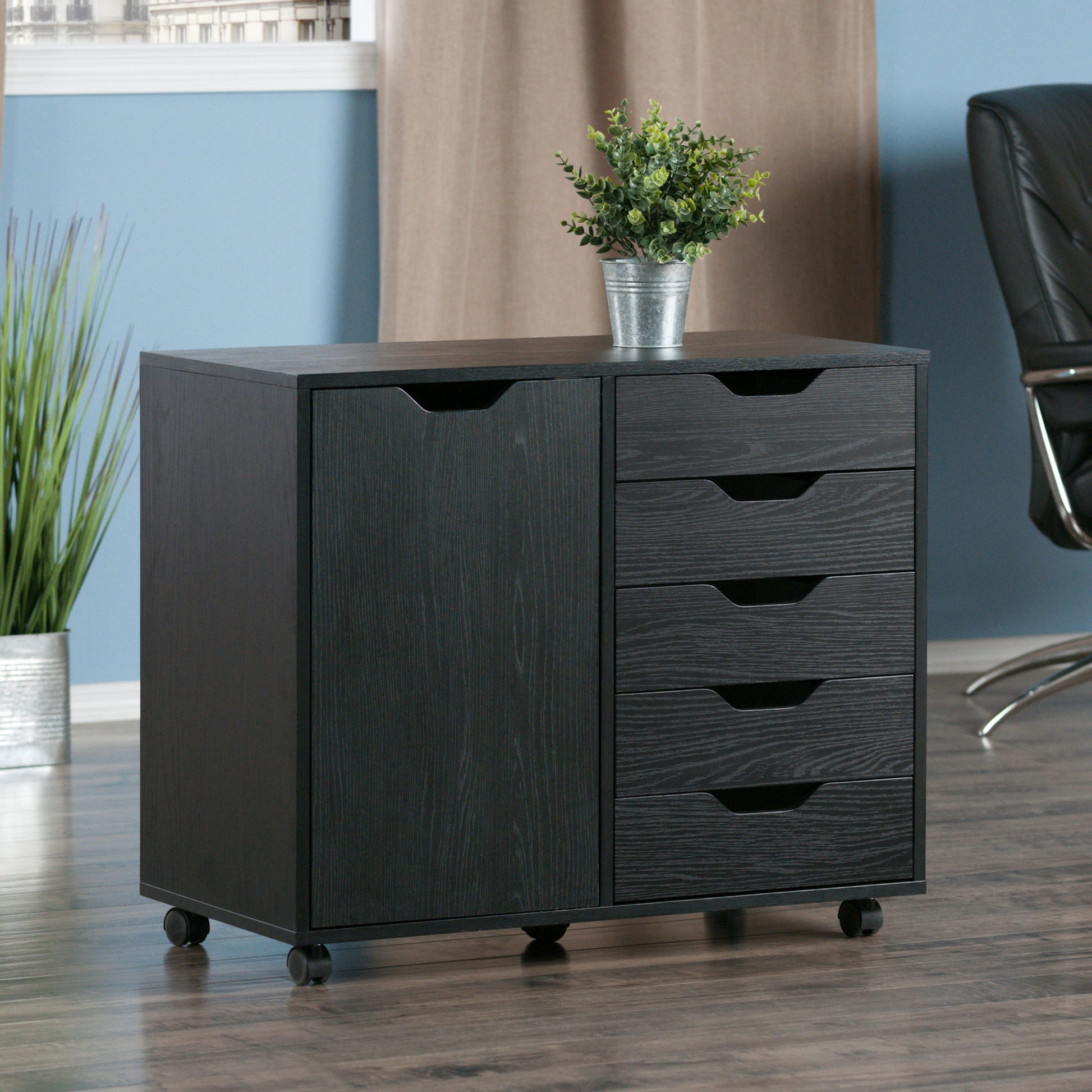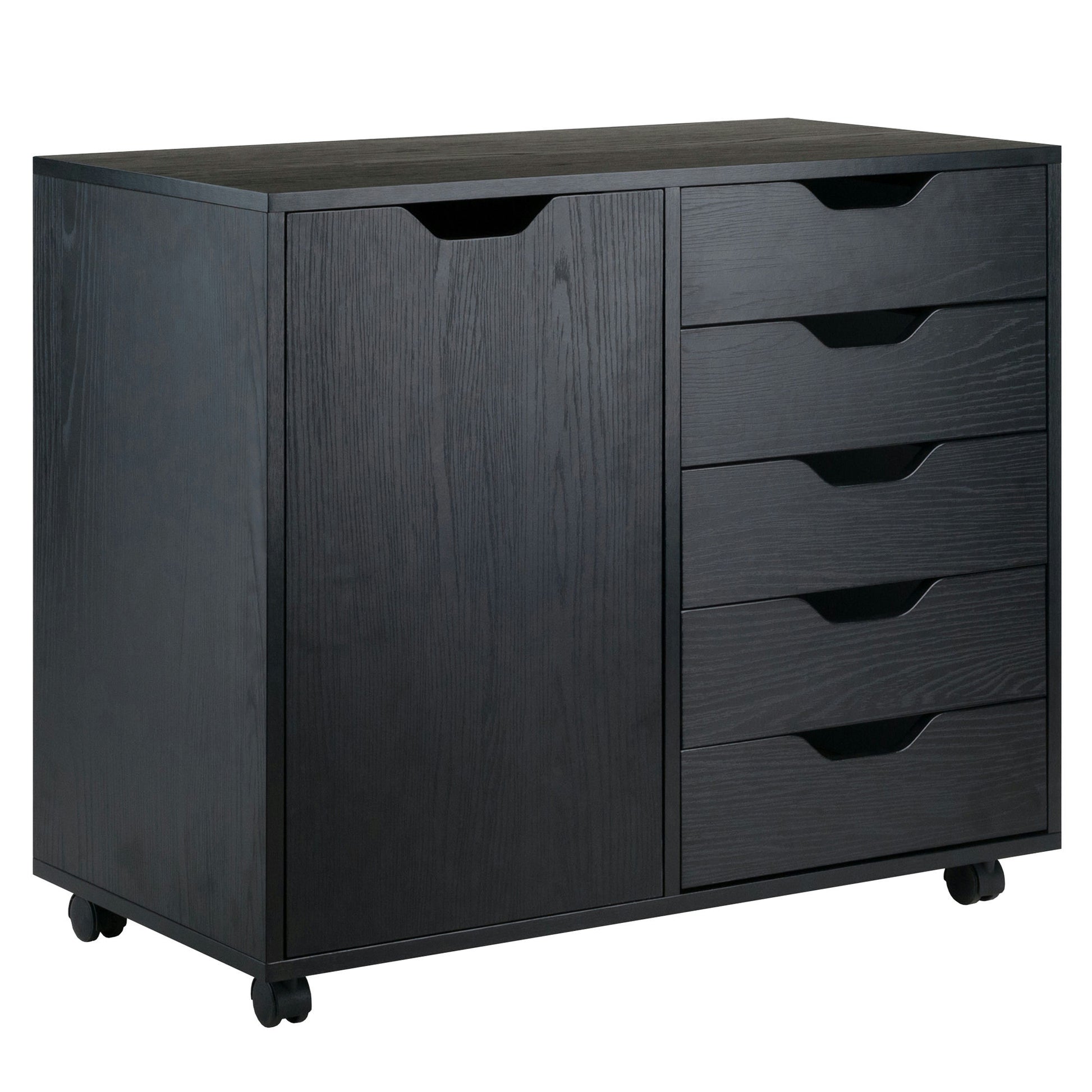 Simple and practical, The Halifax Wide Cabinet is the answer for organizing your documents, craft supplies, and much more. With five drawers plus a sizeable 2-compartment side cabinet, the mobile cabinet holds more than the typical plastic storage unit. Made of sturdy composite wood in a contemporary black finish.
