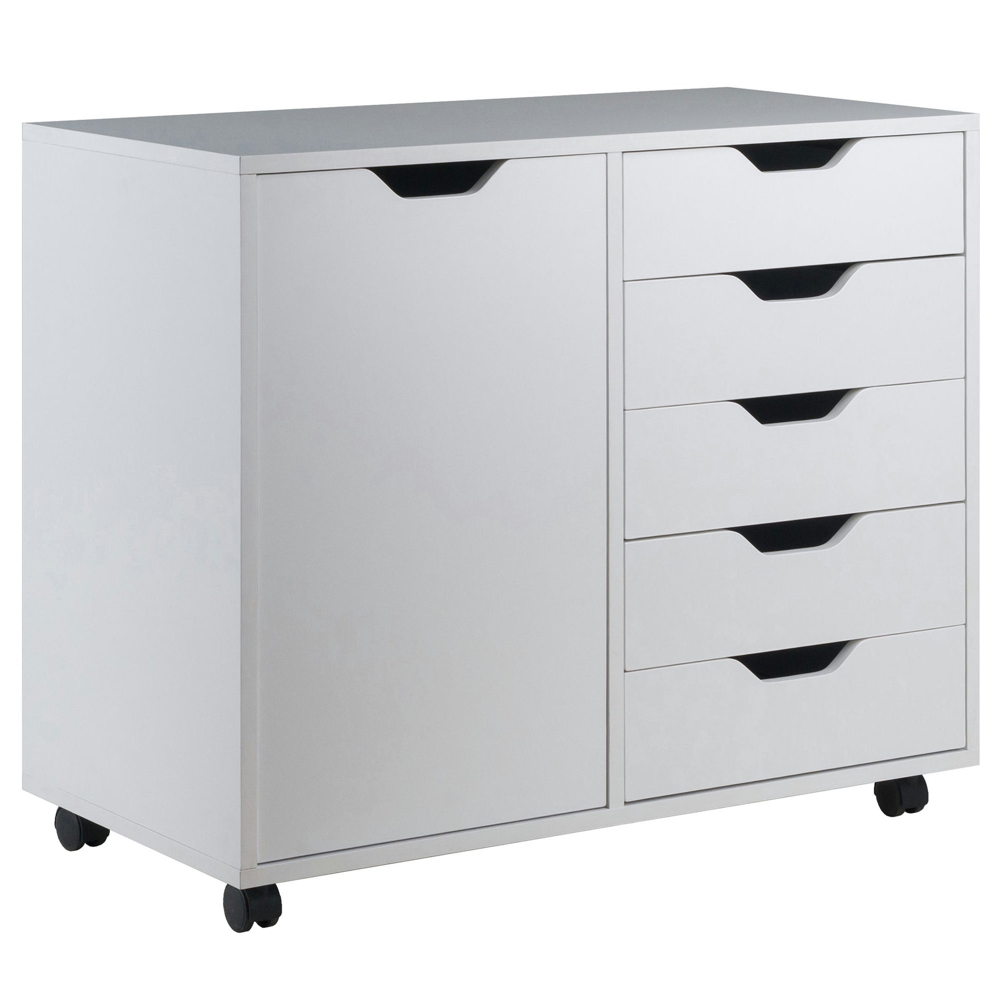 Simple and practical, The Halifax Wide Cabinet is the answer for organizing your documents, craft supplies, and much more. With five drawers plus a sizeable 2-compartment side cabinet, the mobile cabinet holds more than the typical plastic storage unit. Made of sturdy composite wood in a bright white finish.