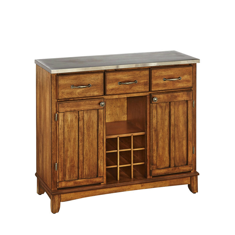 The Hampton Server by homestyles is designed to offer flexible, additional storage and workspace for the kitchen and dining areas of the home. This functional cabinet has a cottage oak finish and 18-gauge stainless steel top. It has expansive storage, with three utility drawers on metal drawer slides and two cabinets, each with an adjustable shelf, plus a center open storage area. The buffet features a nine-bottle wine storage bin that can be removed for open storage. Constructed of solid wood and veneers. Brushed steel hardware accents the cabinet, which is equipped with adjustable floor levelers. Assembly required. It comes carefully packaged with all items labeled and easy-to-follow directions. Size: 36.25"H x 41.75"W x 17"D.